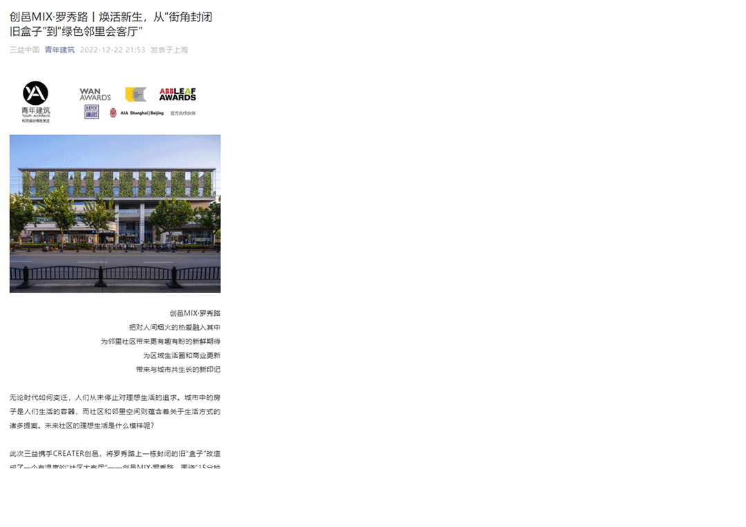 目前,上海创邑MIX·罗秀路已受到搜建筑、建筑邦、青年建筑、建筑师疯人院、梅吟雪飞凤、hhlloo景观网等多家知名建筑媒体报道。