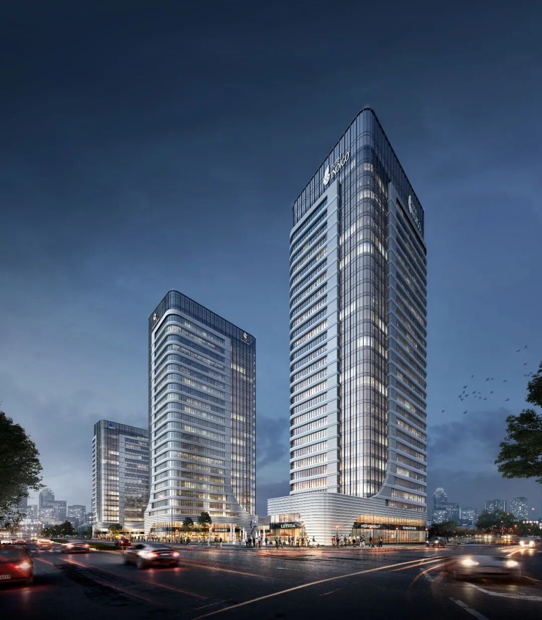 该项目位于济南滨河新区的新东站片区,是东城崛起的重要支点,定位为济南东部新型城市次中心。方案以杜甫《望岳》中:“岱宗夫如何?齐鲁青未了。”为灵感,将济南的峻山秀水抽象化,旨在打造一座城市功能与山水意境结合的“山水城市”。设计将四栋高层错落布局营造出山的峻峭,在立面采用自然流水和风的元素,整体形成“刚中带柔,柔中带刚”的视觉冲击。