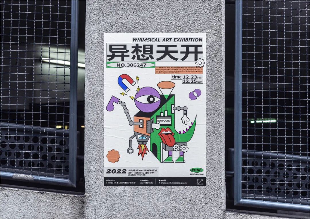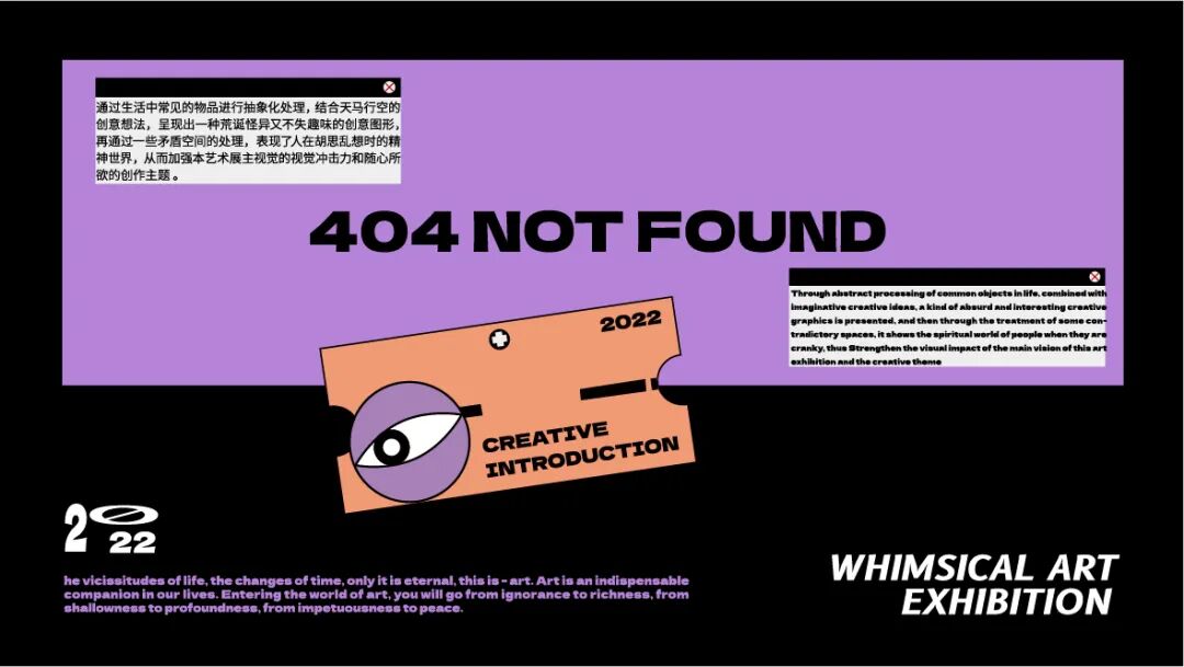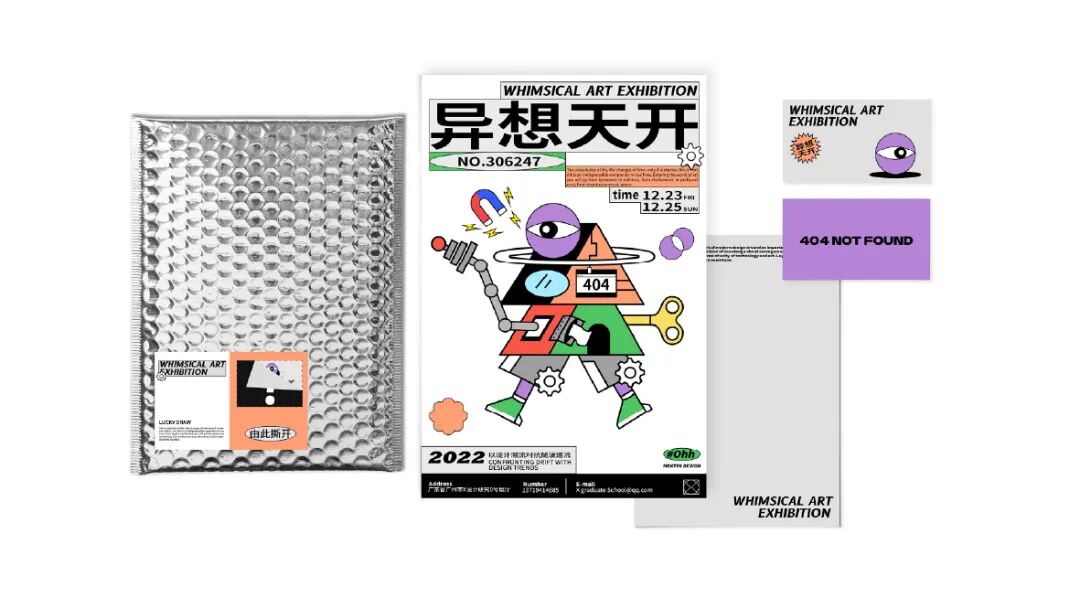 通过生活中常见的物品进行抽象化处理,结合天马行空的创意想法,呈现出一种荒诞怪异又不失趣味的创意图形,再通过一些矛盾空间的处理,表现了人在胡思乱想时的精神世界,从而加强本艺术展主视觉的视觉冲击力和随心所欲的创作主题 。
