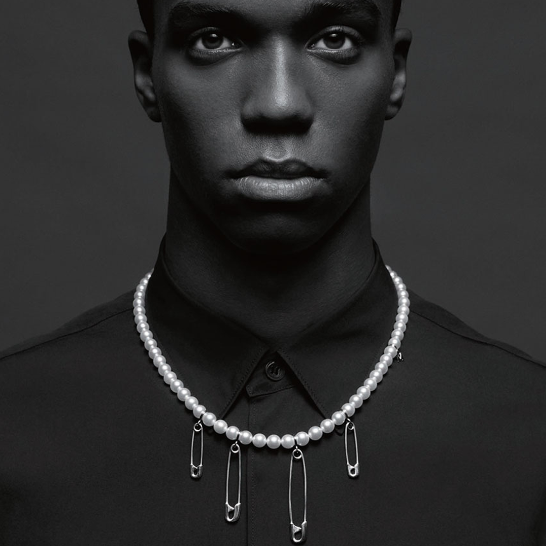 值得注意的是,联名款中出现了珍珠项链。珍珠,被哈卷等潮人带热,是当下珠宝圈最当红的无性别材质。