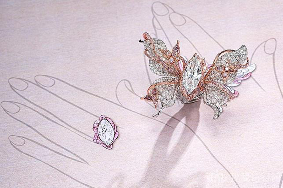 系列共有8件作品,领衔之作是一枚主石8.22克拉的蝴蝶钻戒,它由3只单戒组成,共有6种佩戴方式。据内部人士透露,这枚价值不菲的钻戒已被藏家收入囊中。