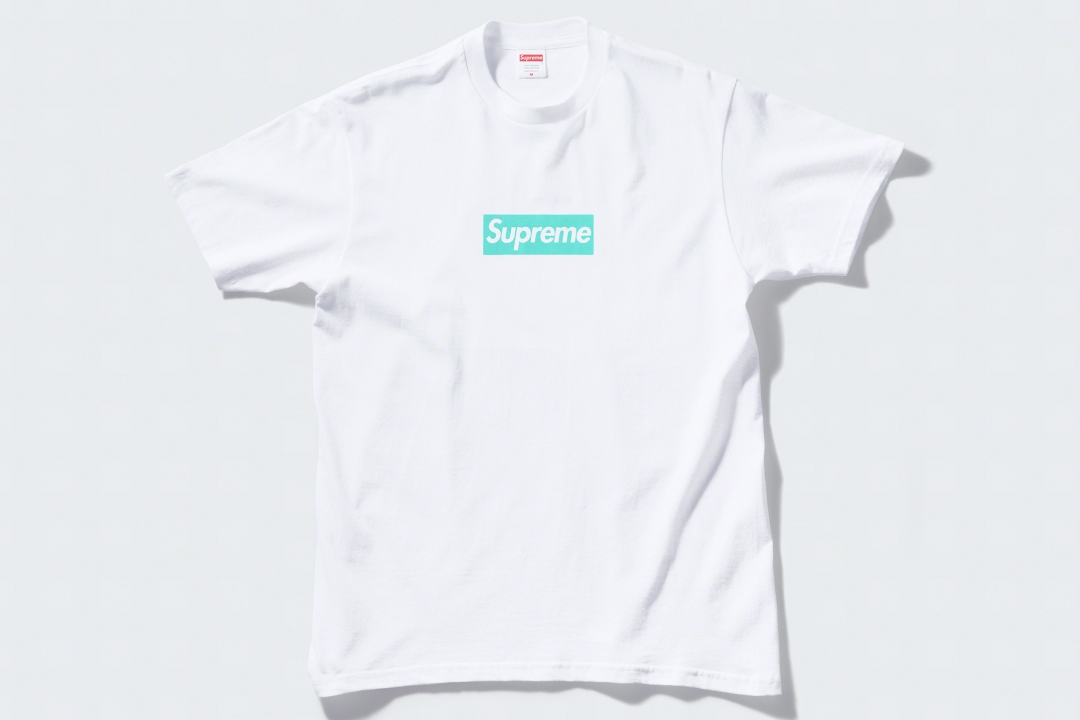 而关注度最高的是一件最简单的白T恤,Tiffany经典的知更鸟蓝底色,白字Supreme赫然胸前。