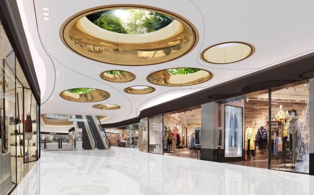 首层高挑空宽阔明朗的中庭设计,结合周边业态形成退台,顶面点阵式LED灯阵与下方连跨两层的叠瀑联动,点亮了整个中庭绚丽夺目的网红打卡场景;高楼层打造了超大广角观景地“流光云洞”廊桥,在廊桥之中设置全透光玻璃落地窗,在此不仅可以将城市美景尽收眼底,更能打破室内室外边界,在室内感受阳光到来的治愈力量,为消费者提供更精致的生活享受。