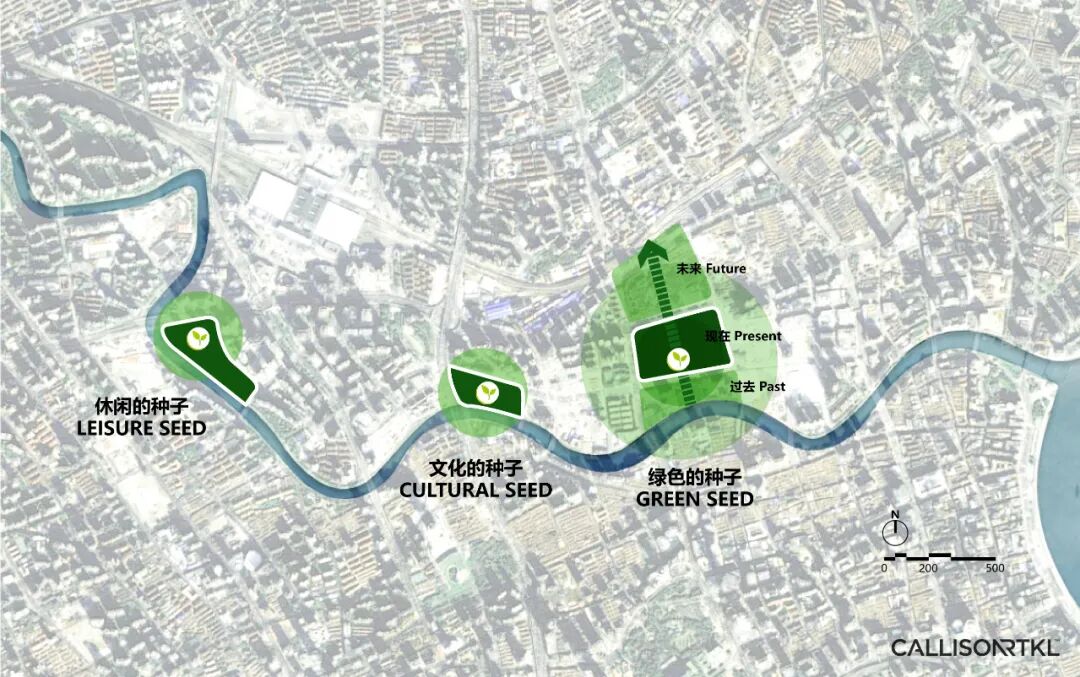 我们在项目初期撒下了三颗“种子”。第一颗“绿色的种子”——以城市公共空间整合分散的资源,释放更新信号。第二颗“文化的种子”——以文化复兴带动滨水文化产业的繁荣。第三颗“休闲的种子”——借助洲际酒店的优势打造休闲娱乐空间,拉动枢纽服务和旅游休闲。每颗种子带有不同的使命,并处于不同的关键位置,配以不同的策略,发展中期种子就近生长,开花结果,远期来看,城市潜能被激发,将依靠自身机制实现可持续发展。