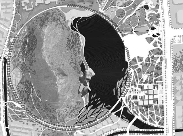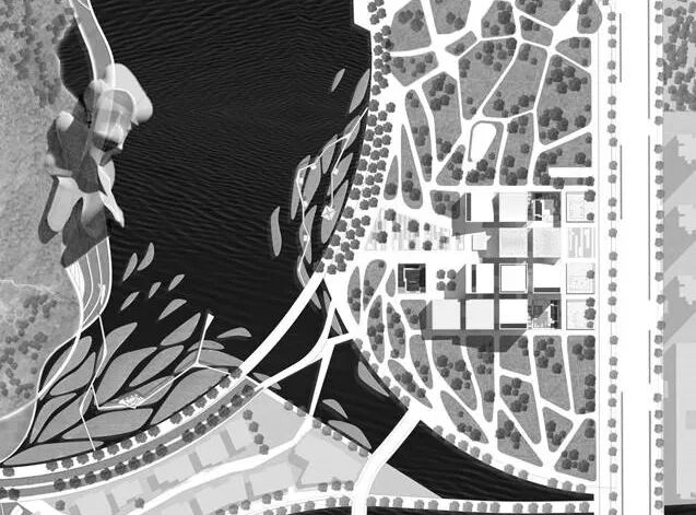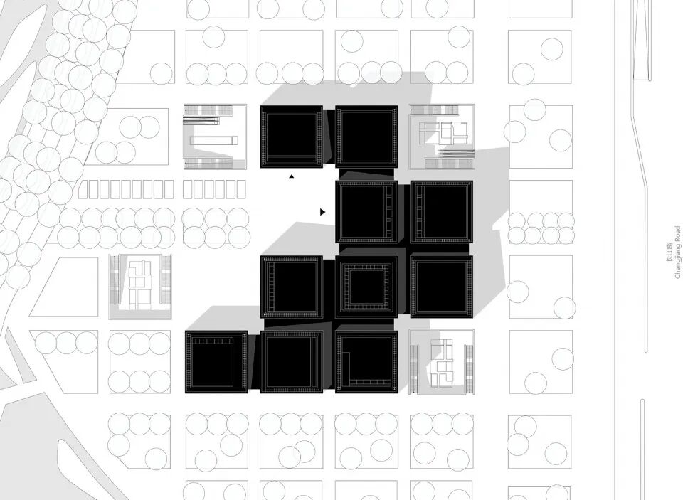 西馆坐落于狮山广场的南翼,未来将建有三座全新的场馆:博物馆,科技馆,剧院。相对于自由形体的大体量剧院及科技馆,西馆着重打造一个以几何立方体组合,小体量的建筑集群的结构形式。这些小立方建筑群位于狮山东南侧一片葱葱绿林中,强调了与景观环境的有机融合。