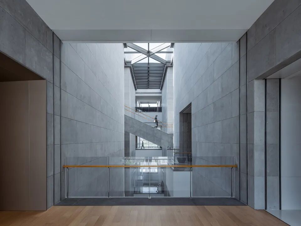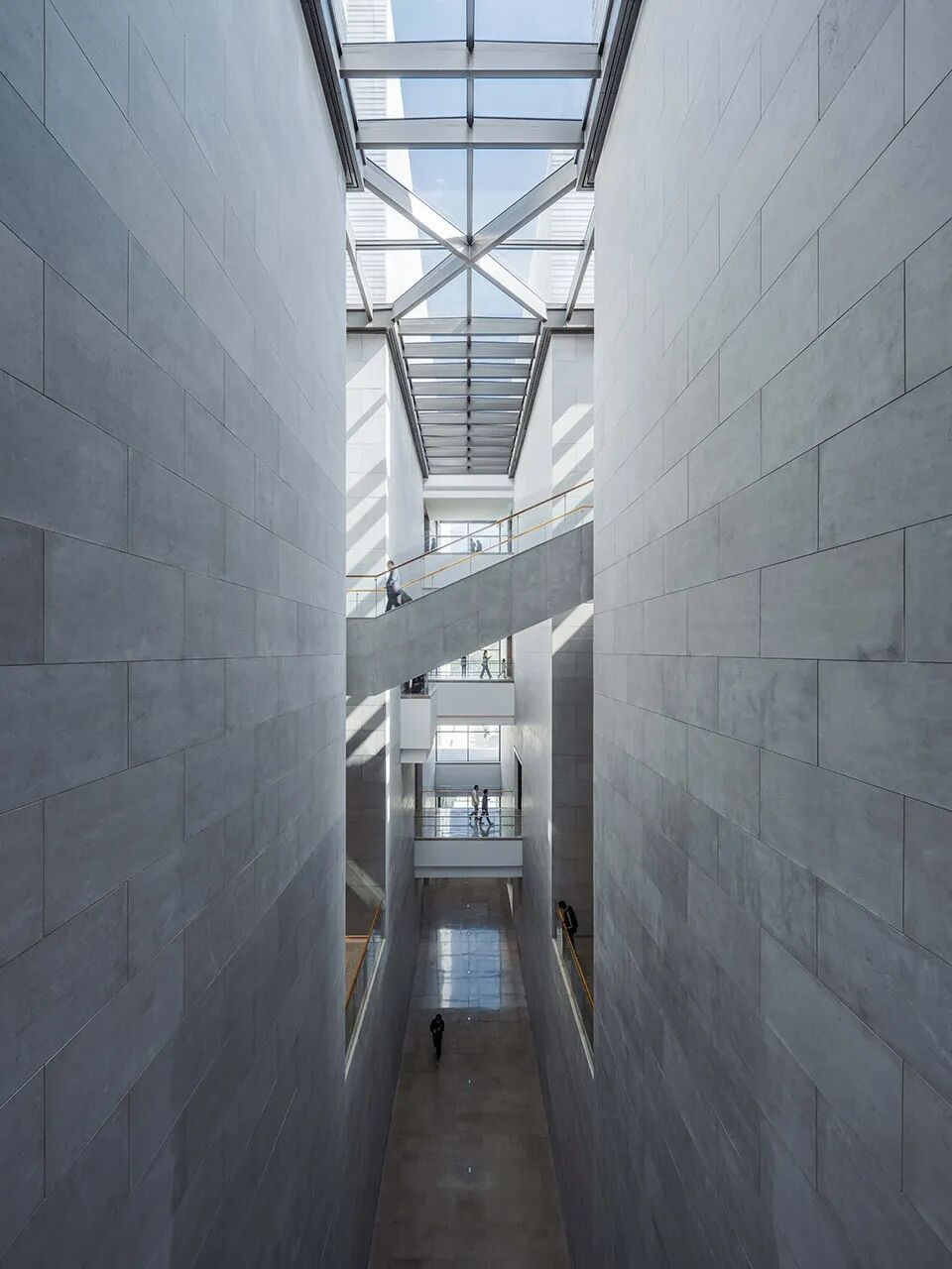 各个展厅的中庭空间为展区的心脏, 将地下一层到地上三层所有重要展厅串联起来,保证了视线的通透性。观众可围绕中庭空间,以顺时针步行抵达至各层展厅。