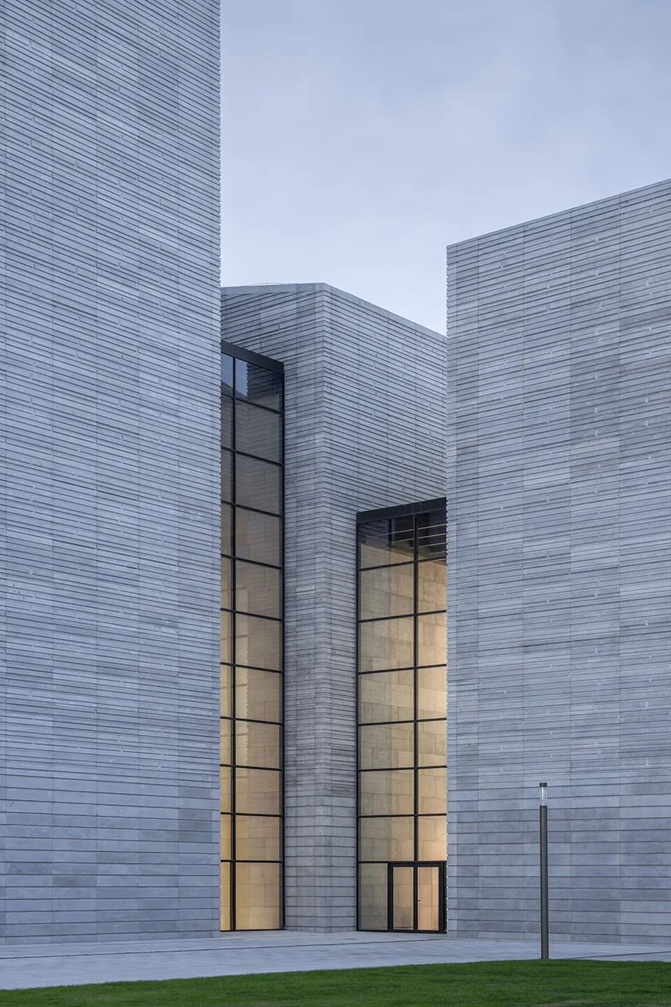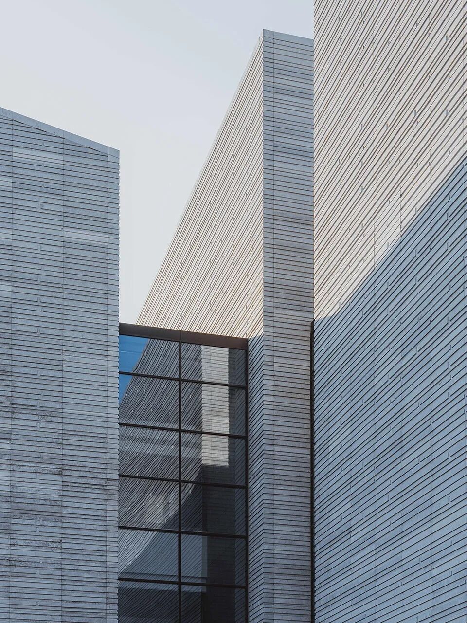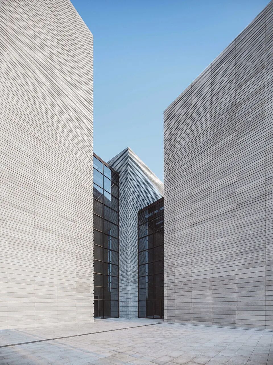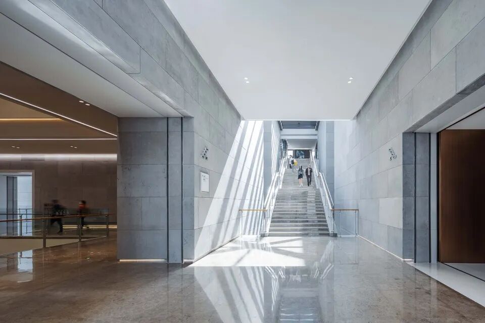 天然石材贯穿整座建筑从屋顶到地下庭院的内外立面。从而使整个项目以雕塑般的姿态矗立于狮子山下,以现代简洁的建筑语言诠释历史与未来。