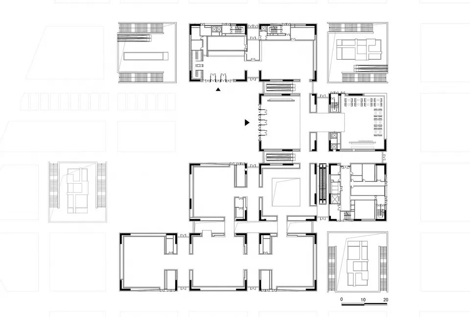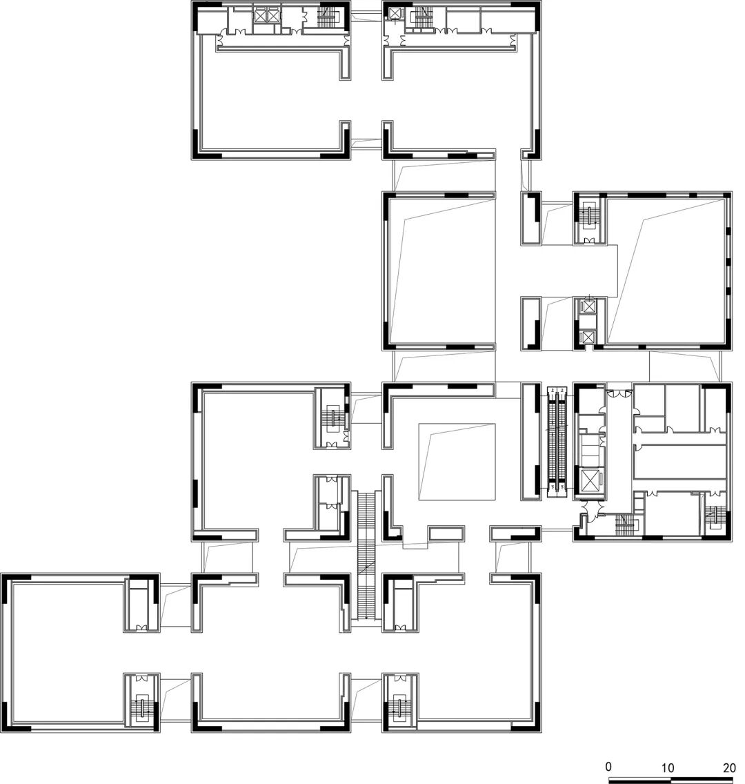 内部空间流线满足博物馆运营方的需求:展览空间可采用多种方式进行水平或垂直方向的灵活组合,以满足固定展览和巡回展览的各种要求。室内设计力求增强观众于复杂空间中的定位感,同时也为观众源源不断地提供流连忘返的观感。观众的主要参观流线从东到西,自北向南,以顺时针为原则。