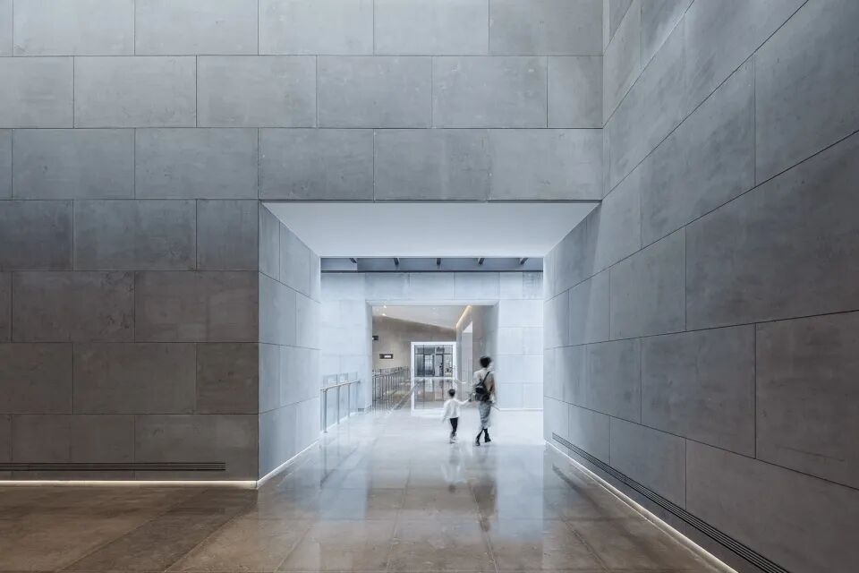 中庭顶层设有天窗,自然光可由此投射至地下一层。墙面及地面铺装延续室外幕墙的浅色天然石材。地下一层为餐厅与学术报告厅,及部分展区的共享中央大厅。不同于主入口大厅与展厅部分的中庭空间,共享中央大厅着重营造接近人体尺度的小空间,通过休息厅的软装饰面,通透的玻璃将下沉庭院的美景引入其中,营造温馨舒适的环境。