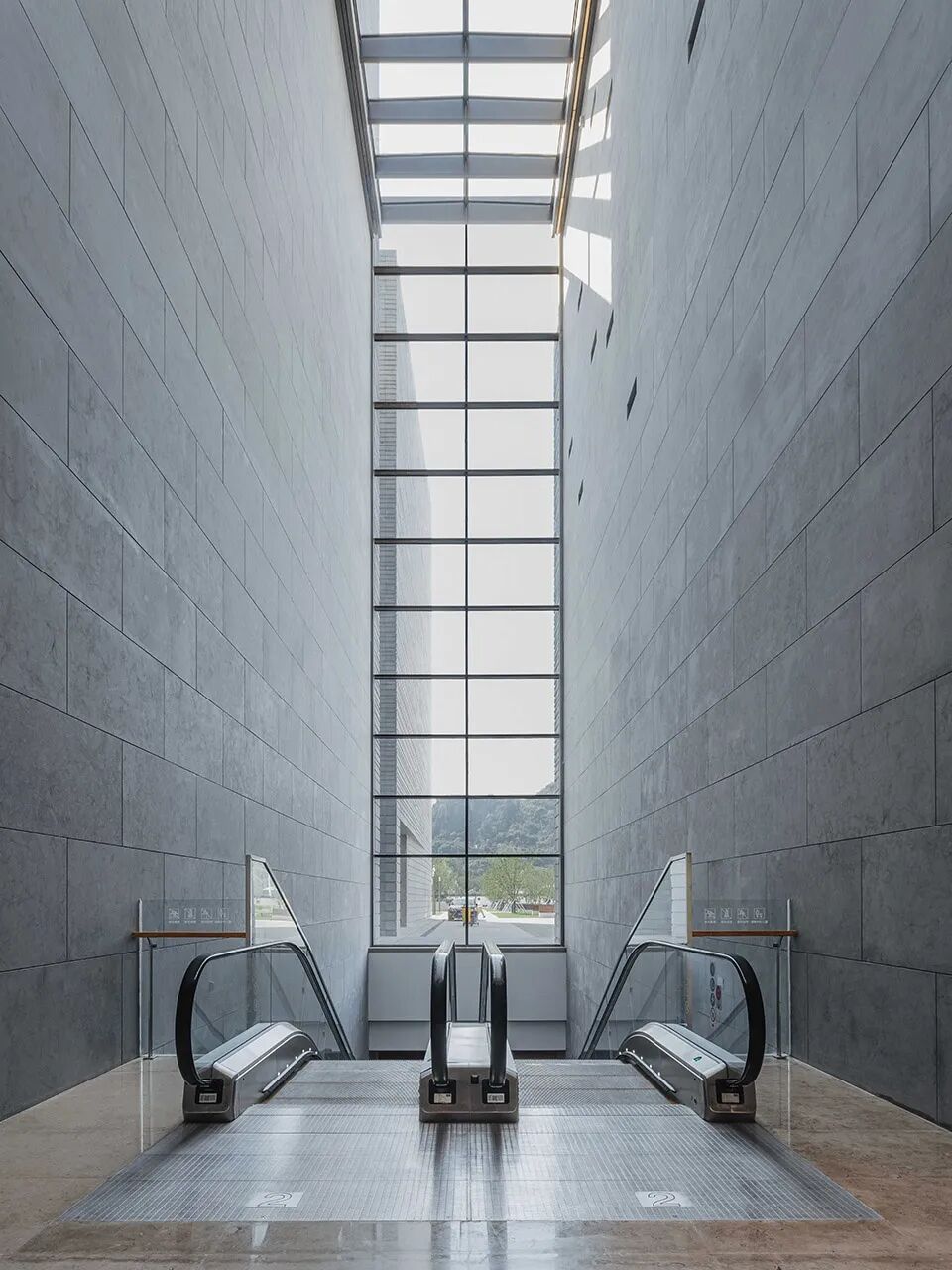 10个展厅均采用实体外墙,但玻璃幕墙的窄巷空间可以让观众自由穿梭其中。在观展的间歇时可瞭望室外的公园湖景和狮子山美景。一虚一实的组合使建筑别具魅力:建筑融入湖光山色,迷人的景致又被镶嵌进建筑中。
