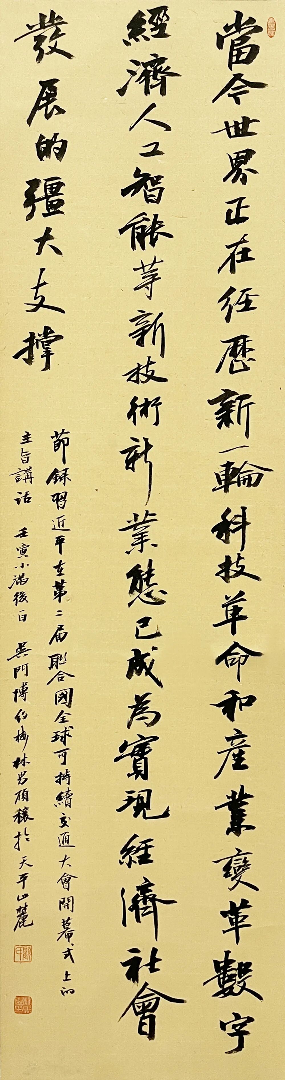 顾林男 行书条幅 《习近平在第二届联合国全球可持续交通大会开幕式上的主旨讲话》节录  138×35cm  2022年