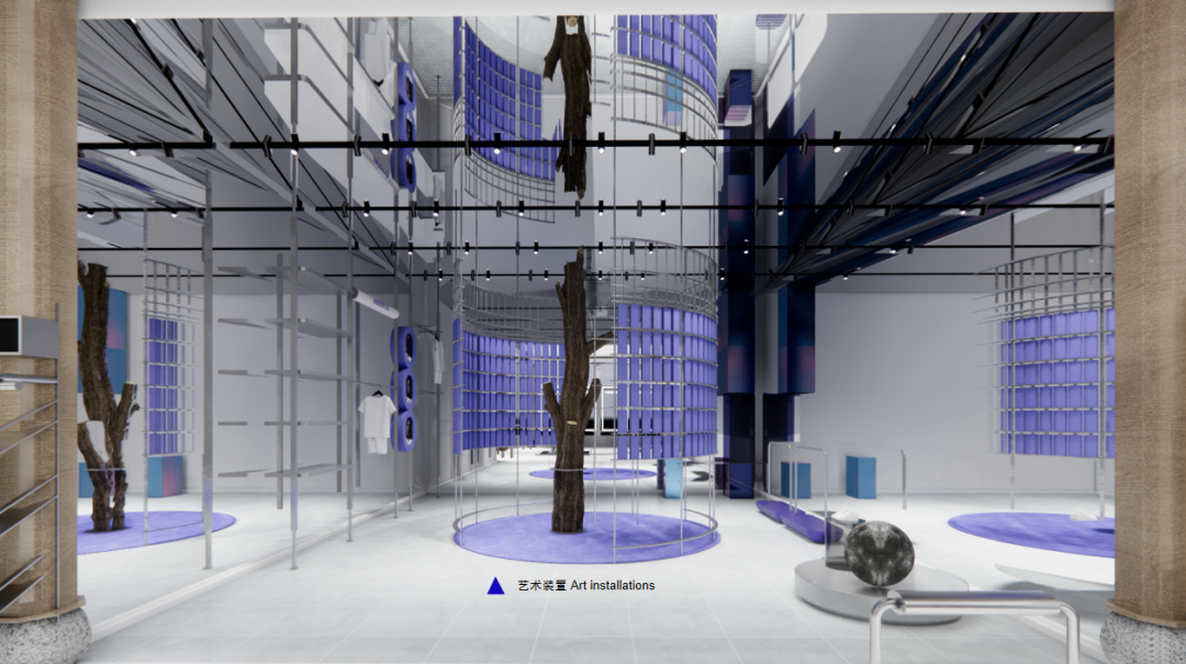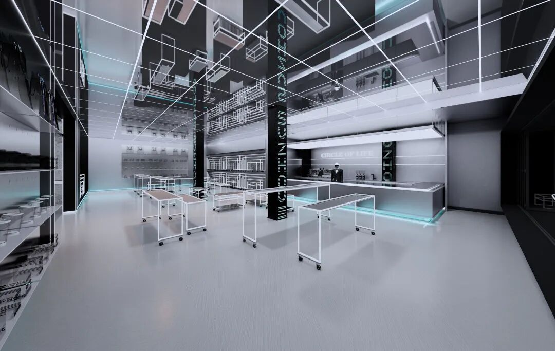 空间的平衡感知在于内外的延伸,向外的秩序,将人的感知力无限延展,自然的野蛮生长,让科技与历史对立统一,生命因文明而繁盛的亘古禅意呼之欲出。移动、旋转、分散、聚集,座椅和陈列柜于空间中切换形态,适应于零售与展览空间的属性变化。拒绝令人目眩神迷的浮华,舍弃昏暗的沉闷。