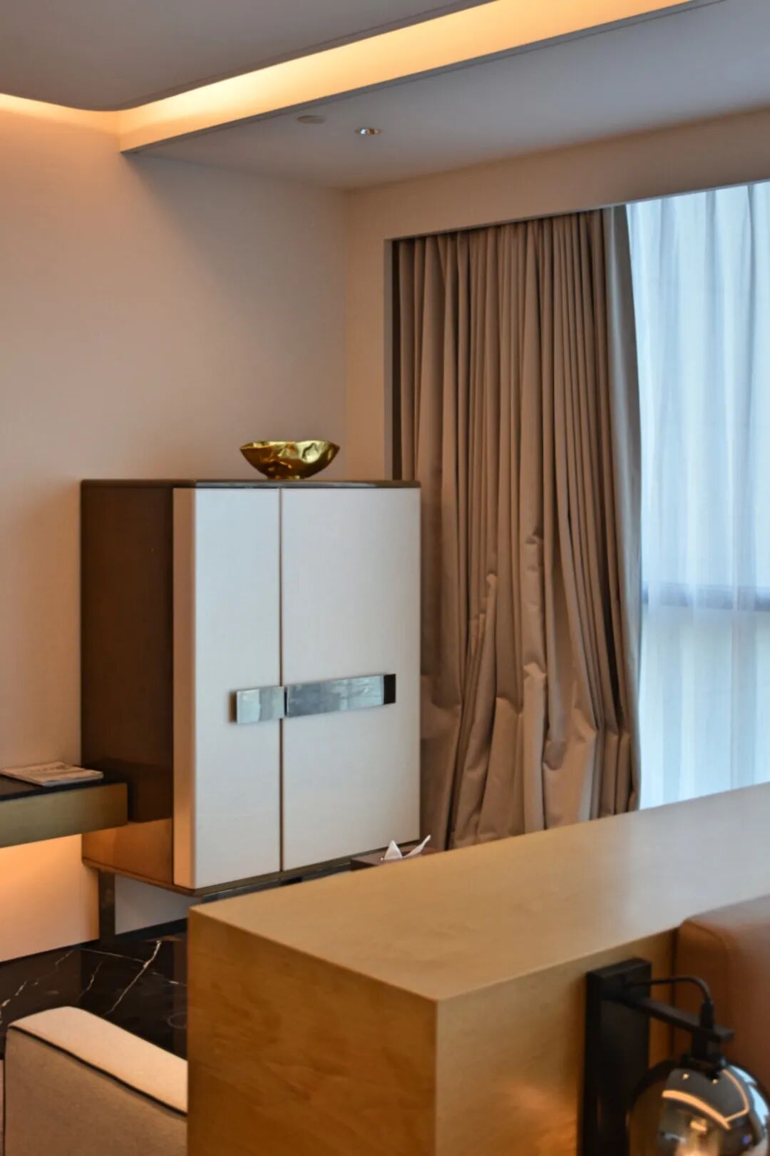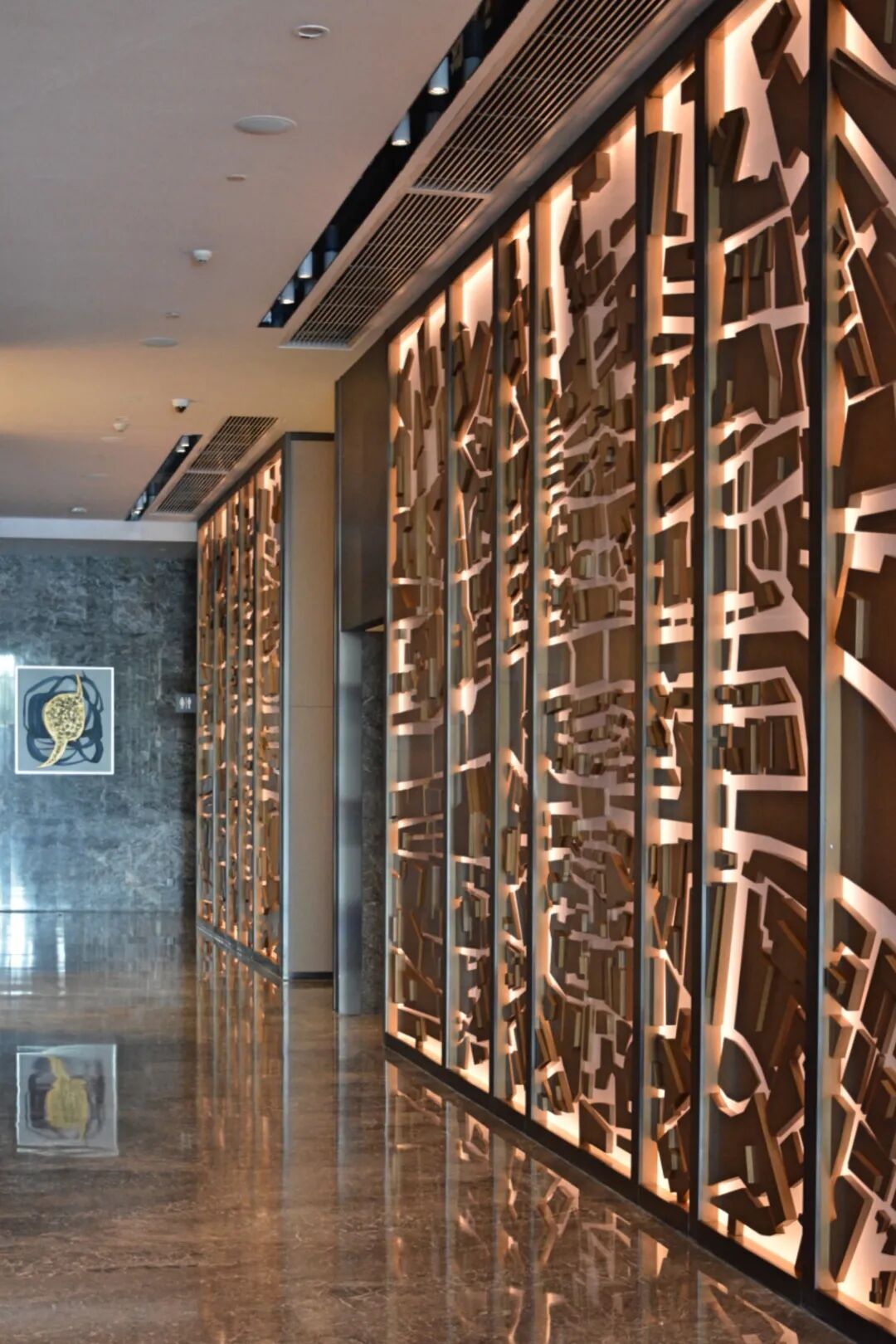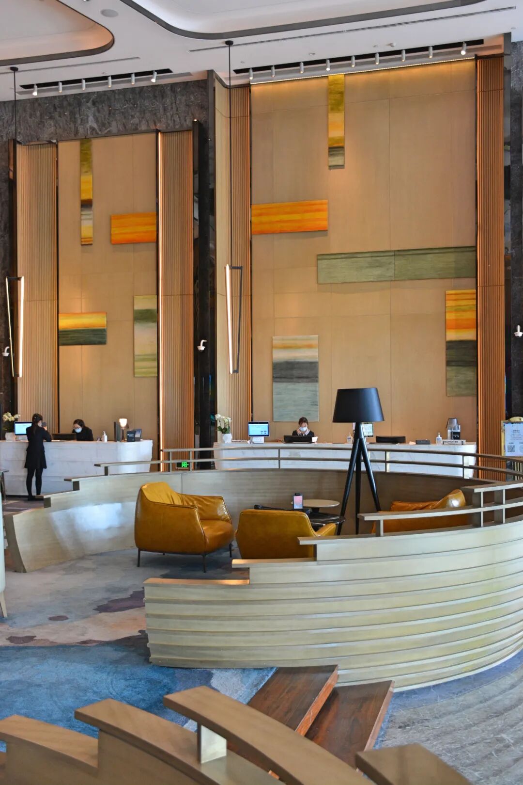 酒店大堂的黑金系配色、挑高但不过分的中庭、简约而又斑斓的前台背板、如园林主体布局般占据C位的大堂吧,