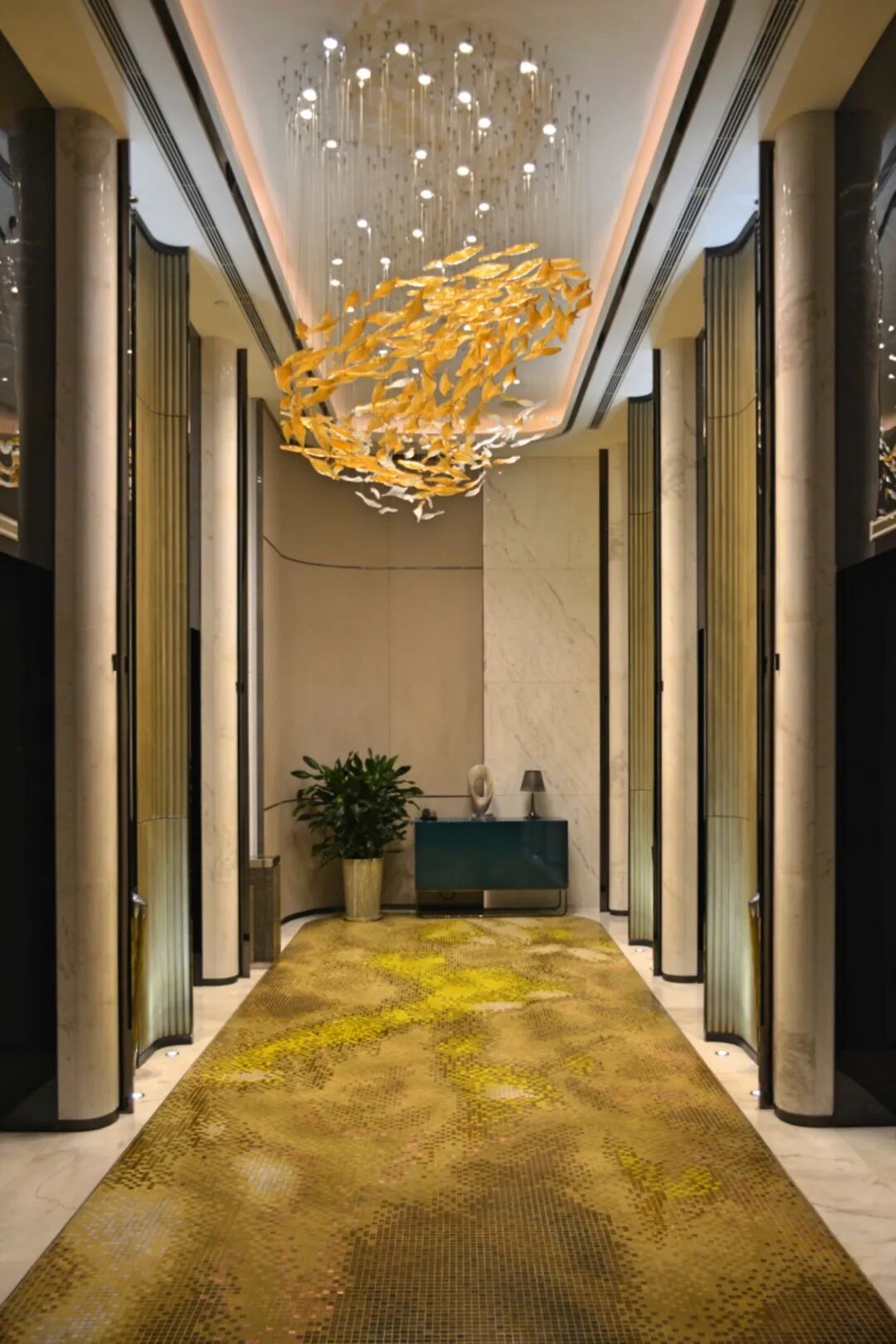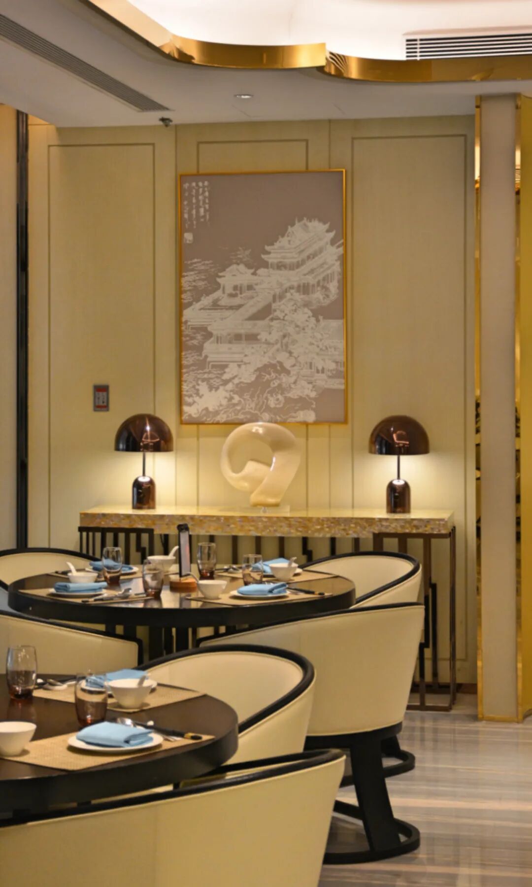 连同太湖石造型的金属流线型雕塑,和锦鲤环绕般的顶灯装饰,