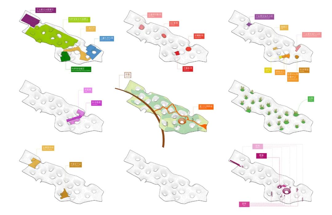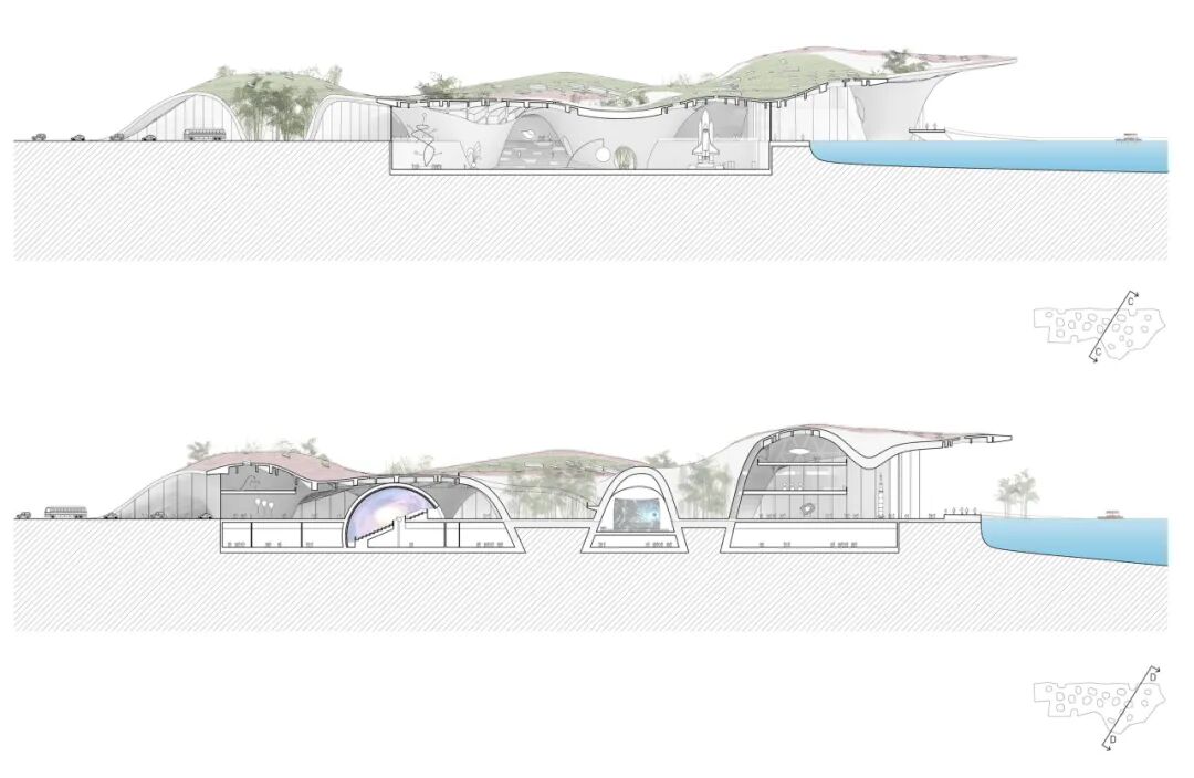 博物馆的屋顶与公园的环路相呼应,经过景观美化成为公园的延伸,步行道穿过公园与城市。下沉庭院中的竹园将地下室内空间与上方的周围公园连接起来。较大的项目区域﹣﹣包括儿童科学园、临时和永久展览以及工业馆﹣﹣分布在整个场地。四个剧院为展览区提供了多媒体辅助空间,即使在博物馆关闭时也可供公众使用,而活动、辅助和后台程序则满足了博物馆更多的功能需求。