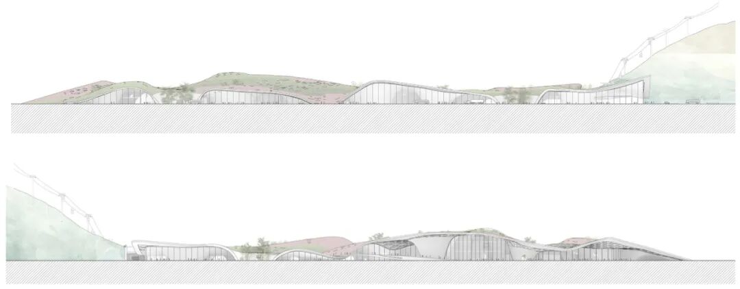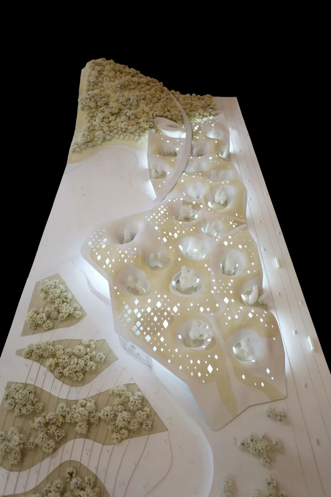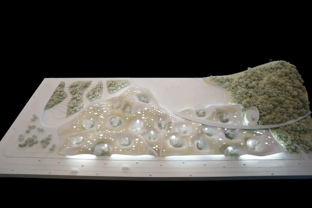 kdA 对新博物馆的设计采用综合景观策略作为建筑形式制作的主要手段:一个大型公园表面被压入桥墩,以提供结构支撑和种植区。这种地形形式鼓励公园延伸到整个建筑表面,同时也提供了周围山脉和湖泊的景色。从上方看,这个动态表面类似于另一个行星:广阔、抽象和几何形状,具有行星陨石坑的特征。