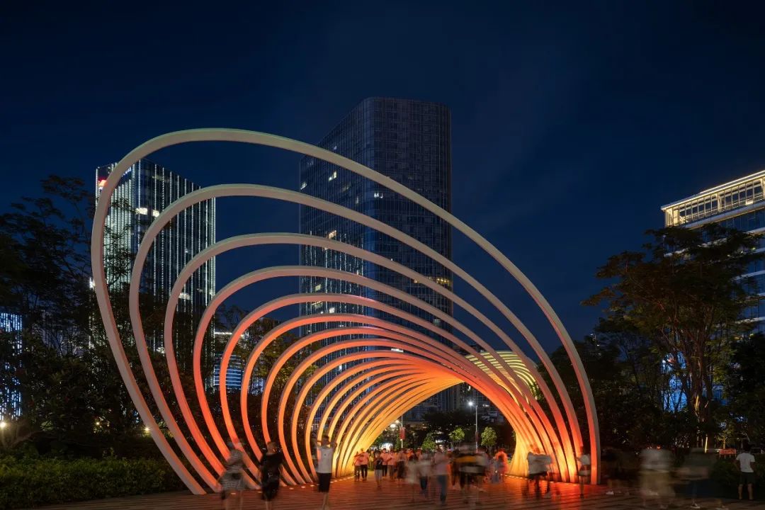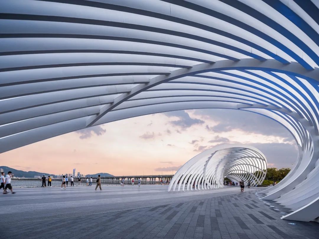 以摩天轮为起点,设计师还在公园内设置了其他九个特色构筑物,这些标志性构筑物一起,进一步强化了公园滨海岸线的吸引力。它们以海洋中的珊瑚,贝壳与飞鱼为灵感来源,设计师通过对这些海洋生物的研究,艺术化地抽象提炼其姿态,并设置在公园的重要场所中,与功能相结合,为人们提供遮荫休憩的绝佳场所。作为公园的又一亮点,设计师与结构单位紧密配合,确保这些构筑物的优雅形态能够完美呈现。这些姿态各异的构筑物不仅是深圳开放多元文化的最佳象征,也是对深圳城市海洋文化的一种回溯。