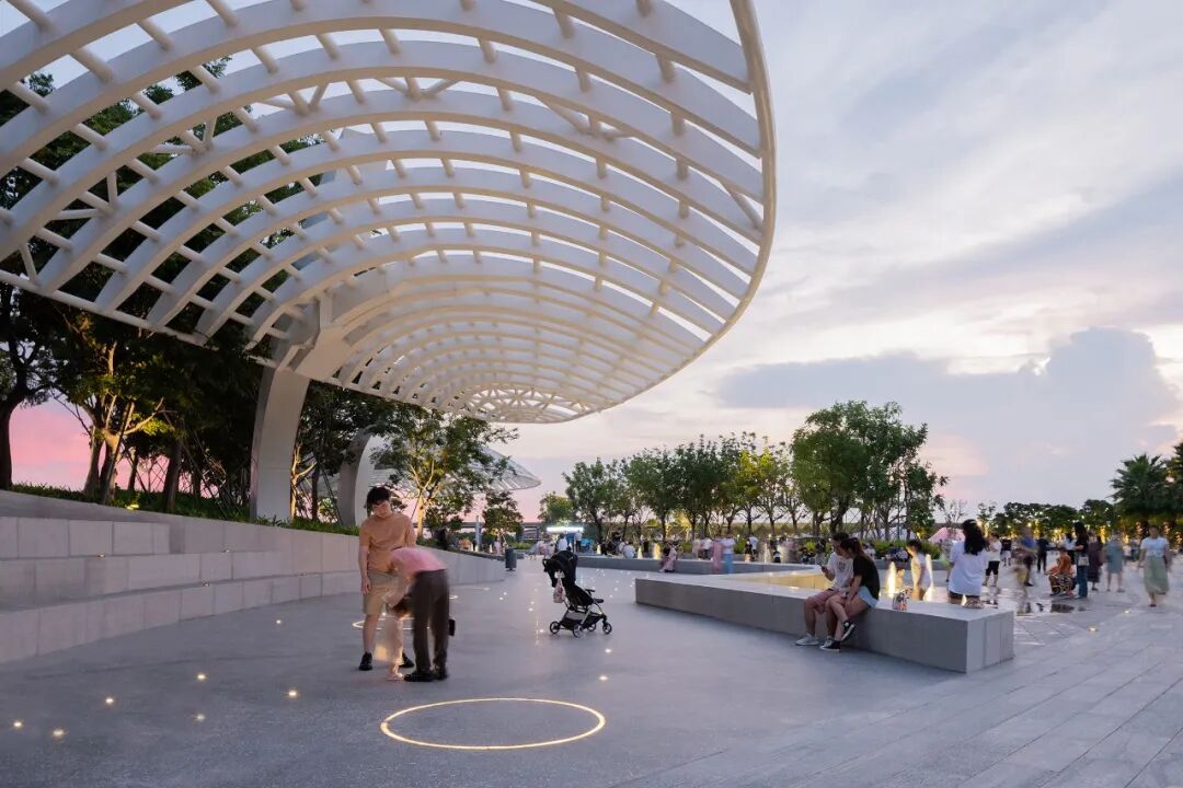 除了引入水飘带之外,设计师为了进一步丰富宝安公园中的水体验进行了多元的尝试。在中央庆典水广场,为了使人们在水秀不开放的时段也可以充分感受到水之乐,SWA设置了一个环形的互动喷泉,喷泉的高度与灯光都在不断地变换,产生丰富的流动旋转效果,全时段最大化了人们的感官体验,既体现了公园的海洋灵感,也与远处旋转的摩天轮相辉映。此外,设计师还结合休息区设置了互动性极强的水景,这些地方是孩子们活动的天堂。孩子在前方通过水景对水进行着全方位的探索,父母则在造型优雅的凉亭中休憩,这样的场景在炎热的深圳,是关于人与水亲密关系的最好诠释。