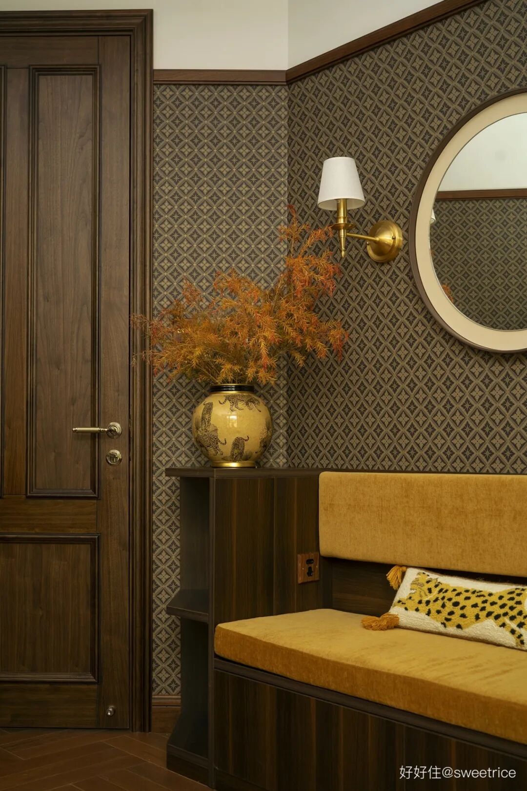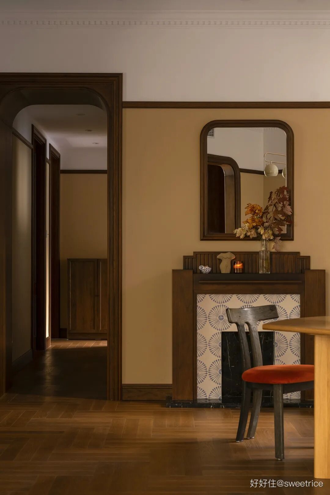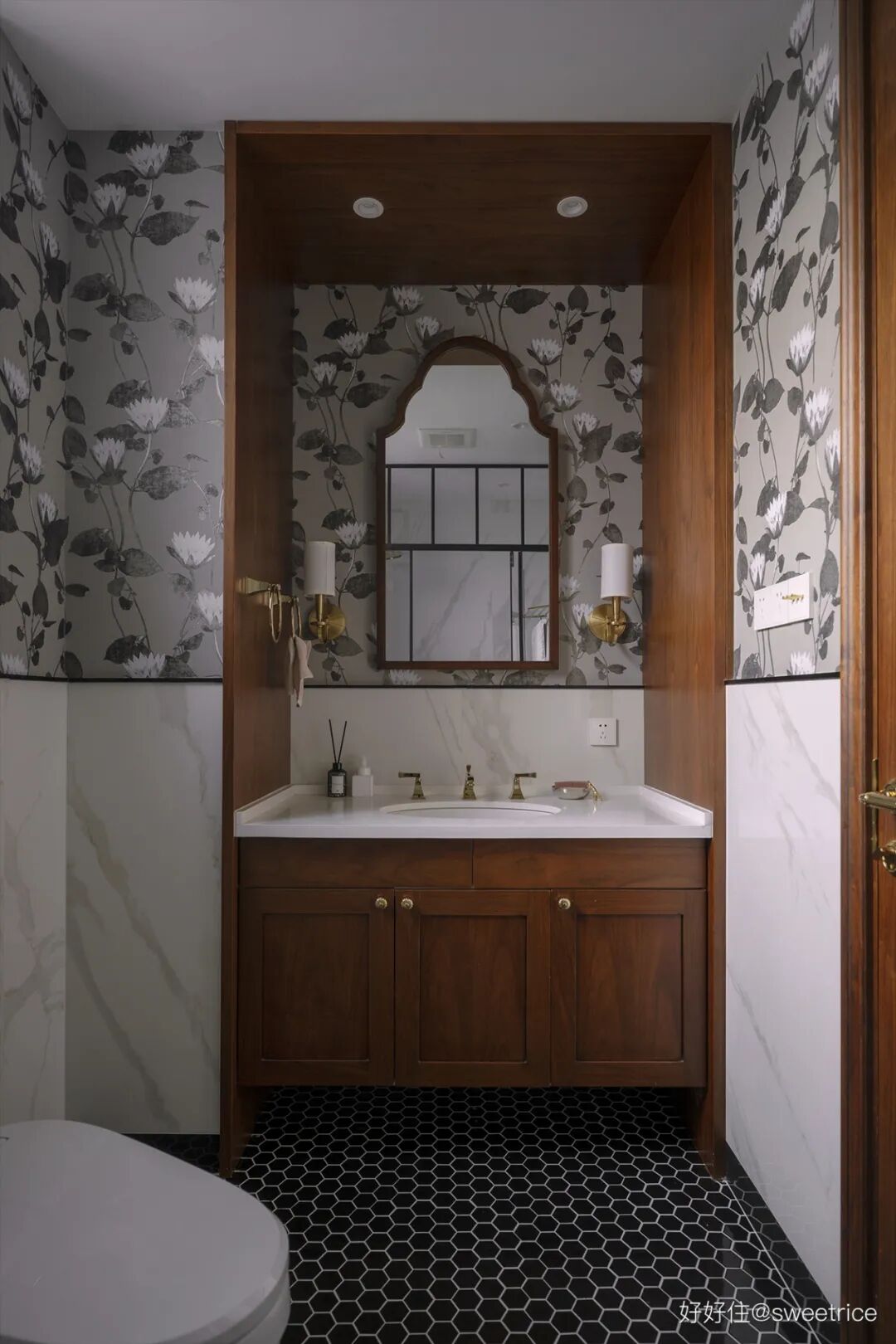 莲花图案墙纸半墙处理,颇具仪式感的木制壁龛柜,壁灯、异形木框镜、六边形马赛克等细节,都彰显了浪漫优雅的复古气质。