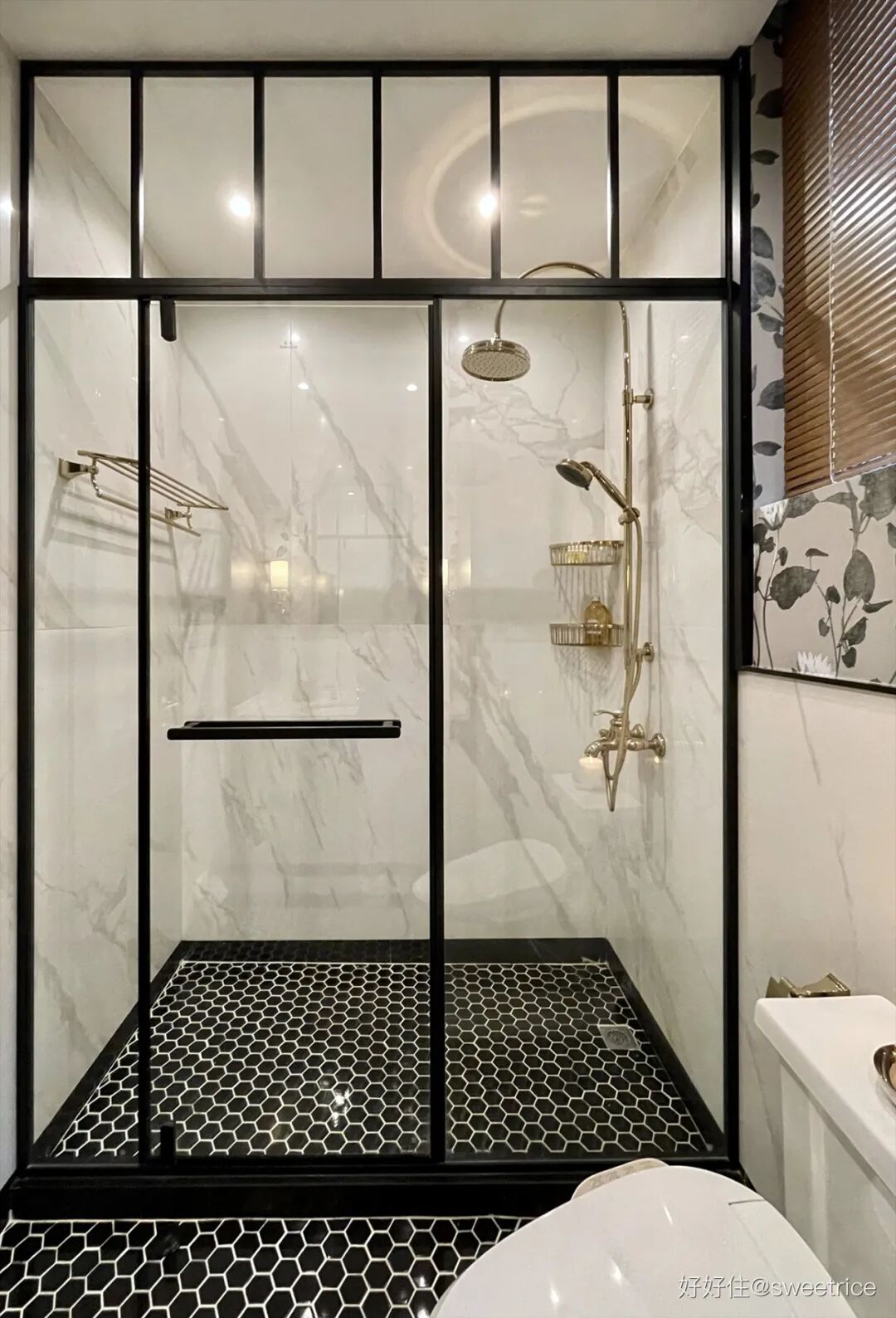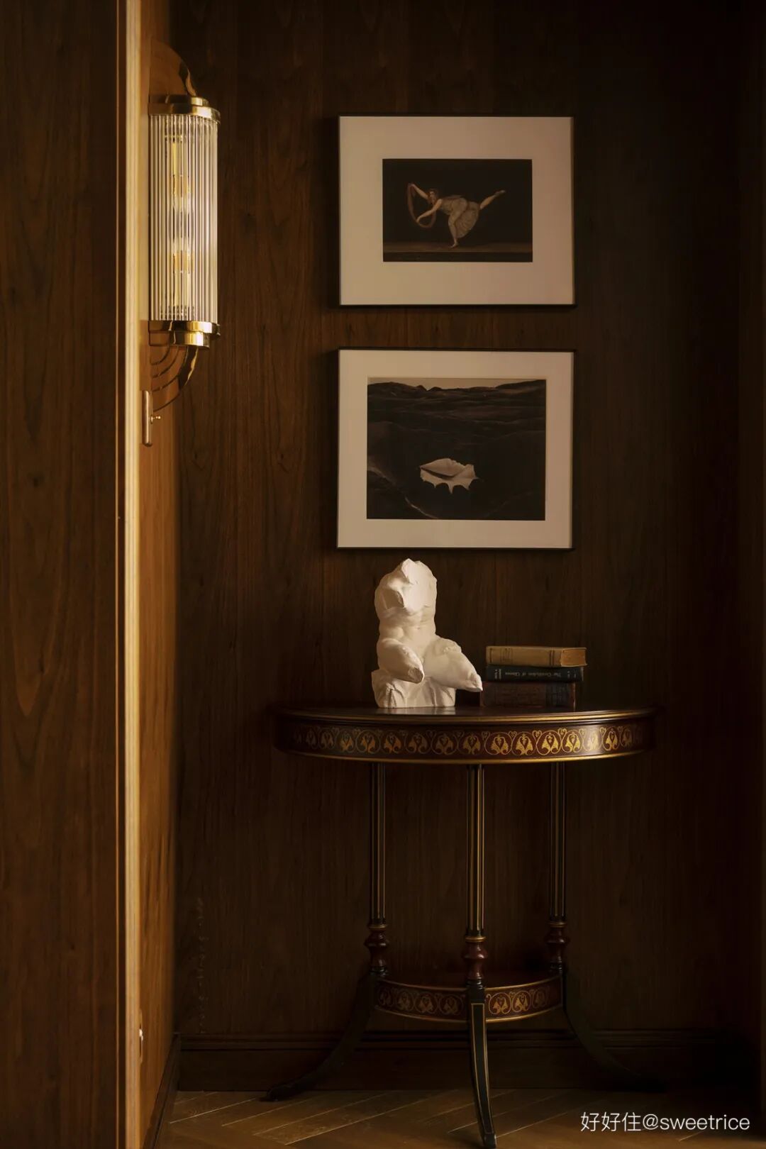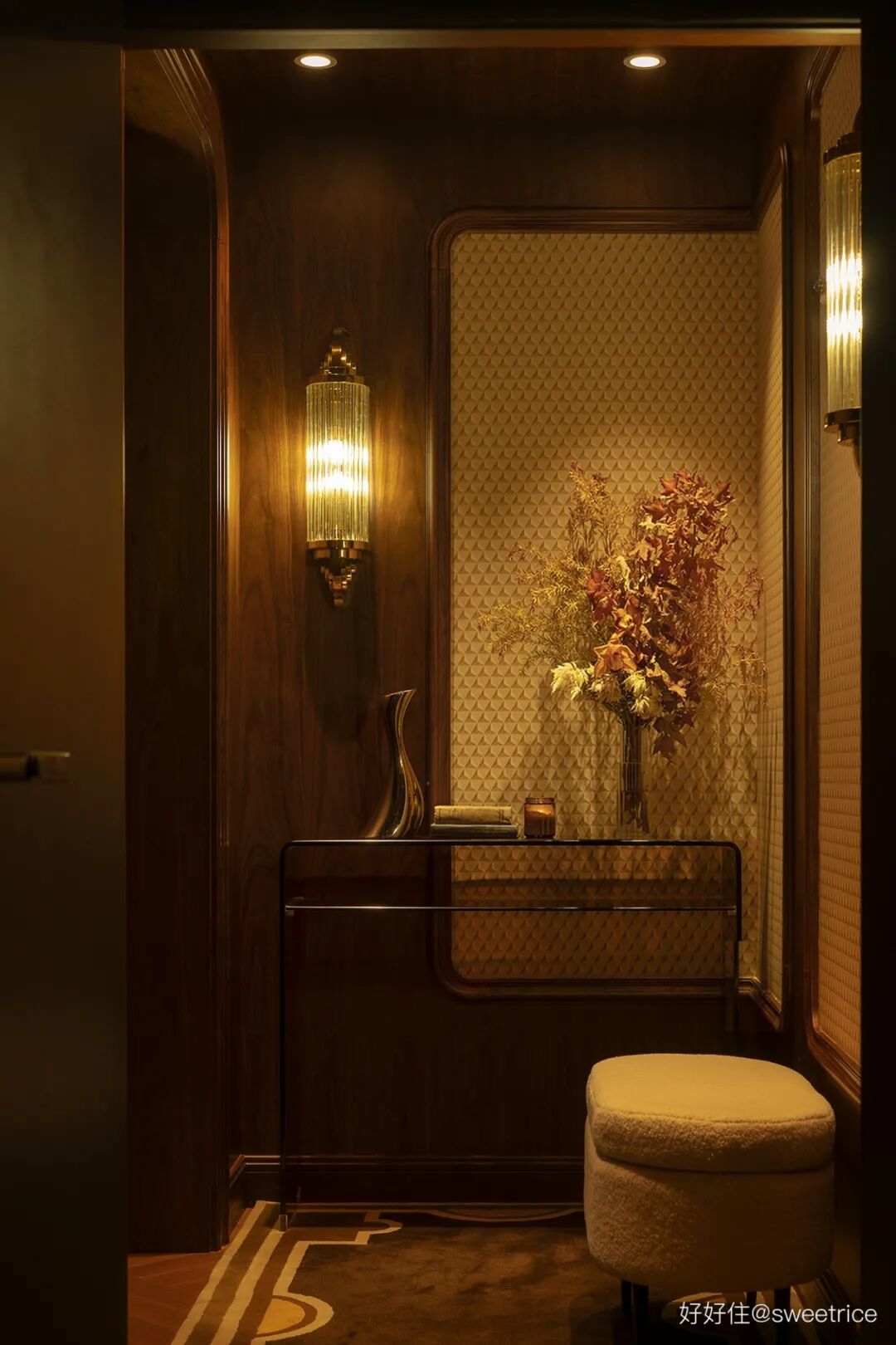 莲花图案墙纸半墙处理,颇具仪式感的木制壁龛柜,壁灯、异形木框镜、六边形马赛克等细节,都彰显了浪漫优雅的复古气质。