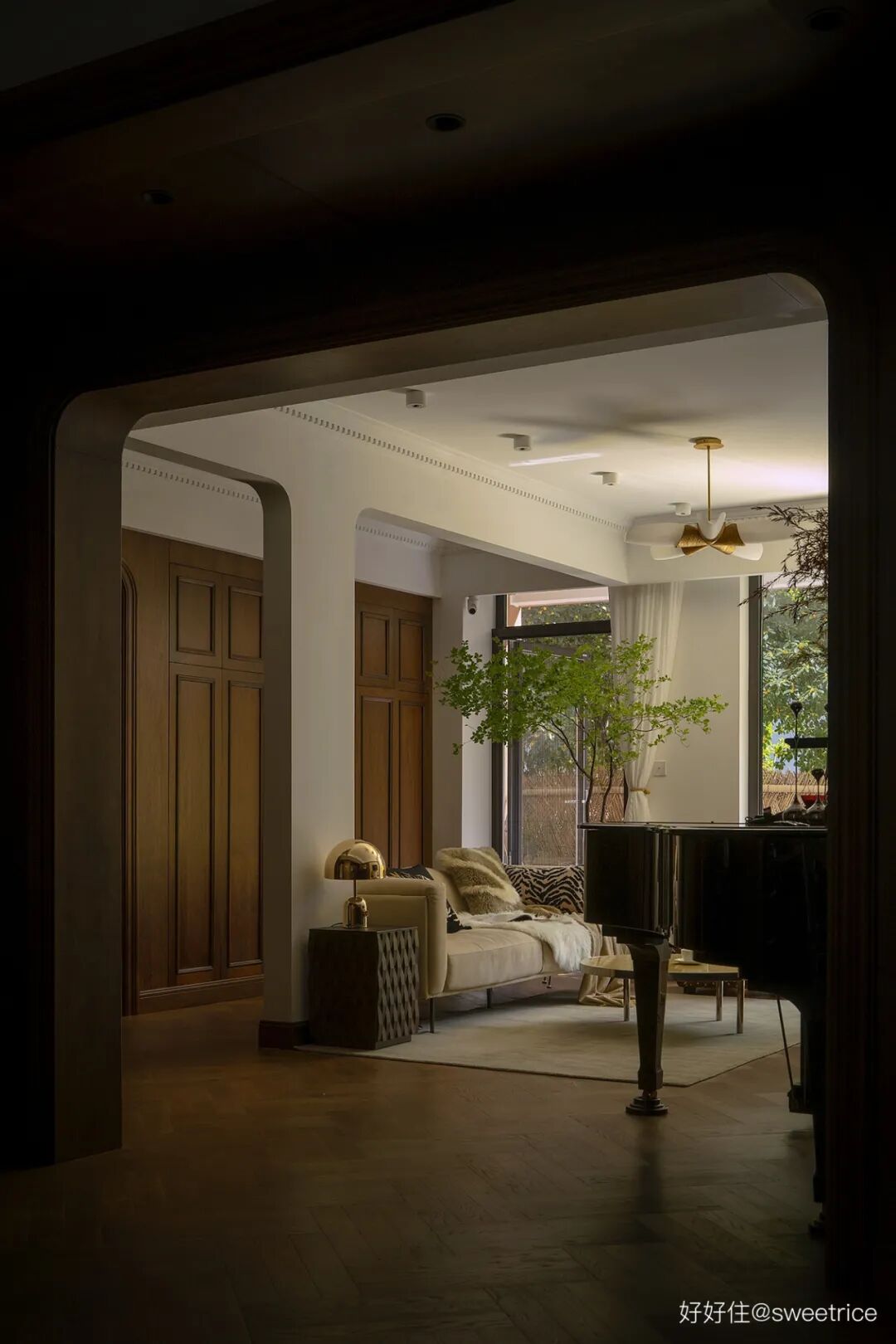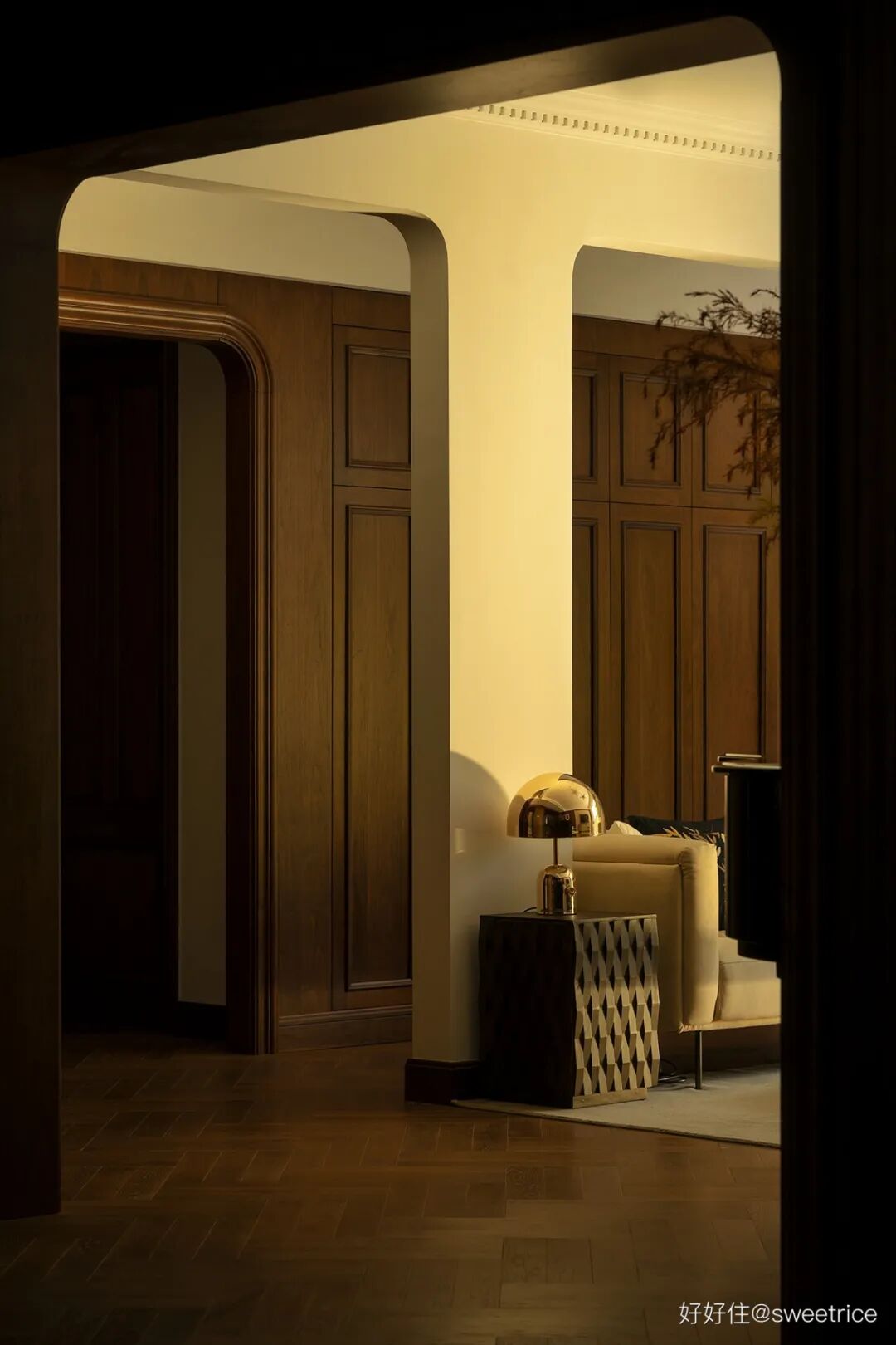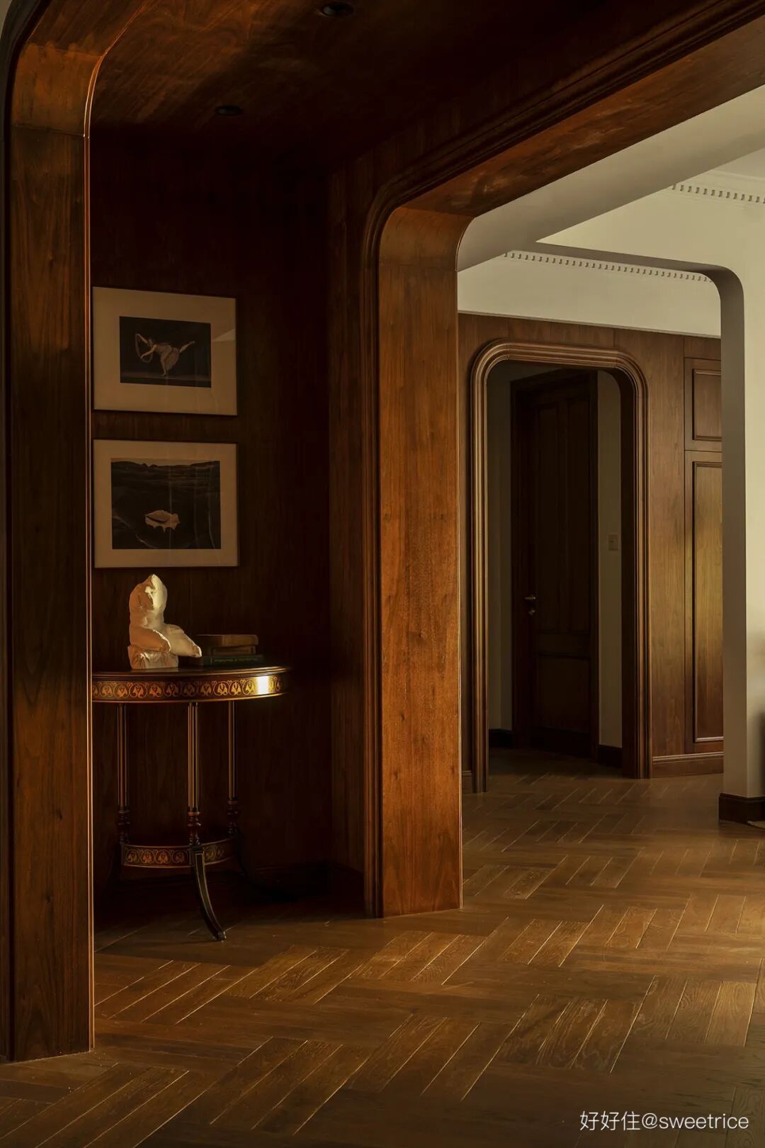 透过门厅结构,视线穿越到餐厅,仿佛进入上世纪的电影场景。