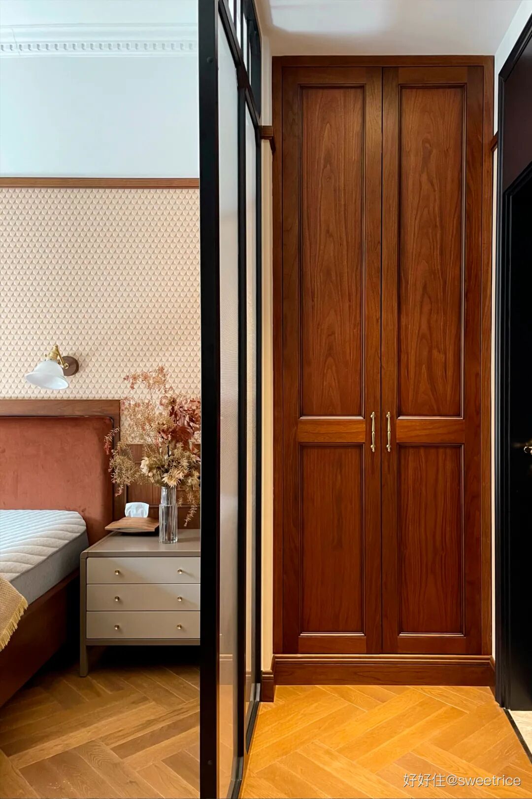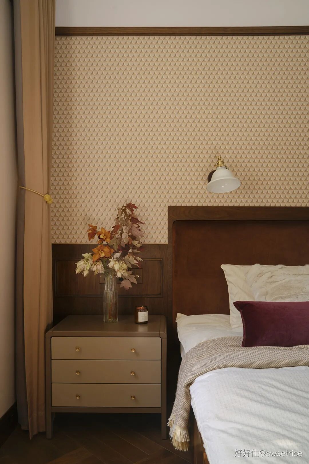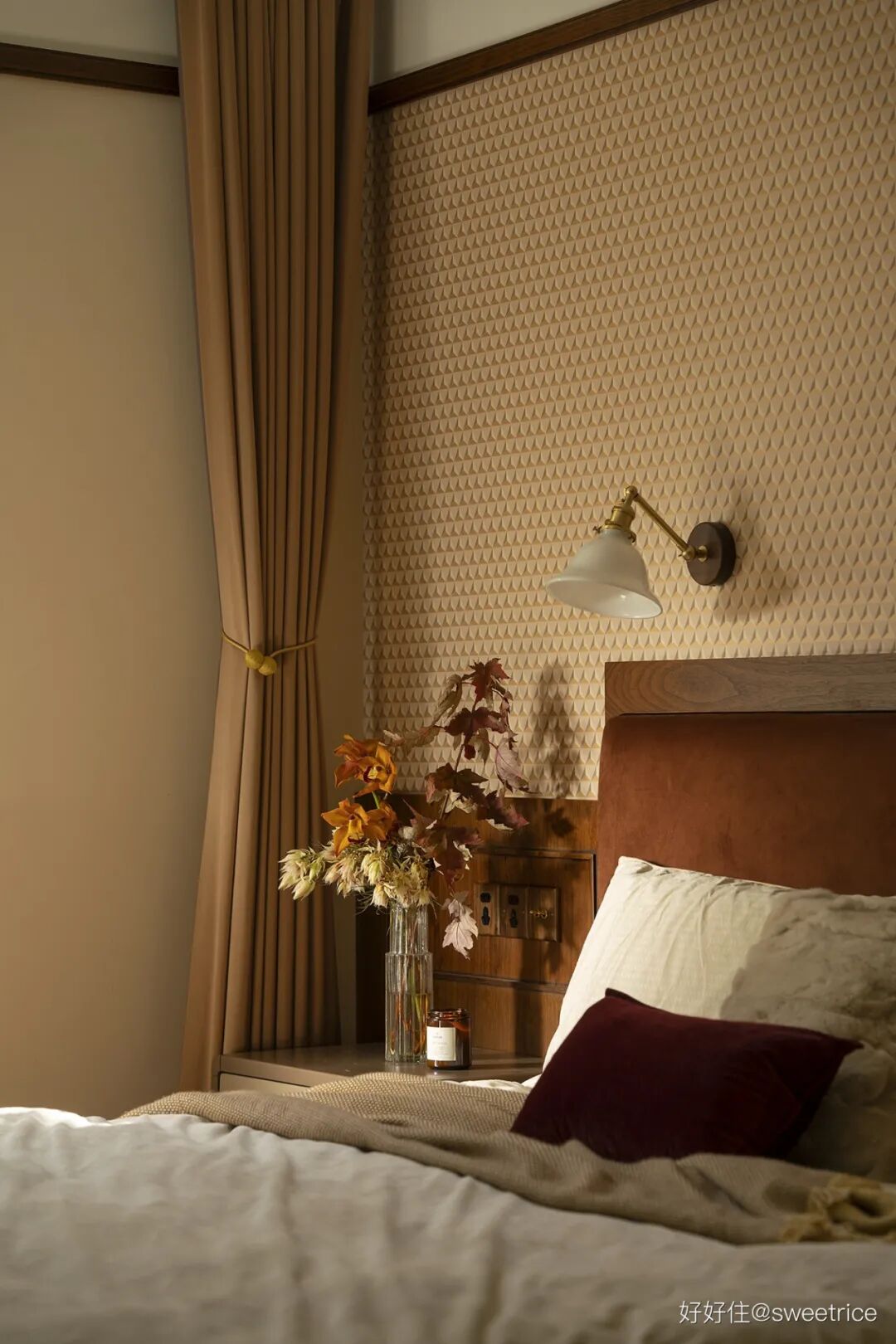 主卧延续了公共空间的木质调,搭配焦糖色丝绒床头,玄关同款墙纸,杏粉色窗帘。整体配色温暖细腻,床头插上橙色的蕙兰和枫叶,瞬间唤醒空间的秋日诗意。