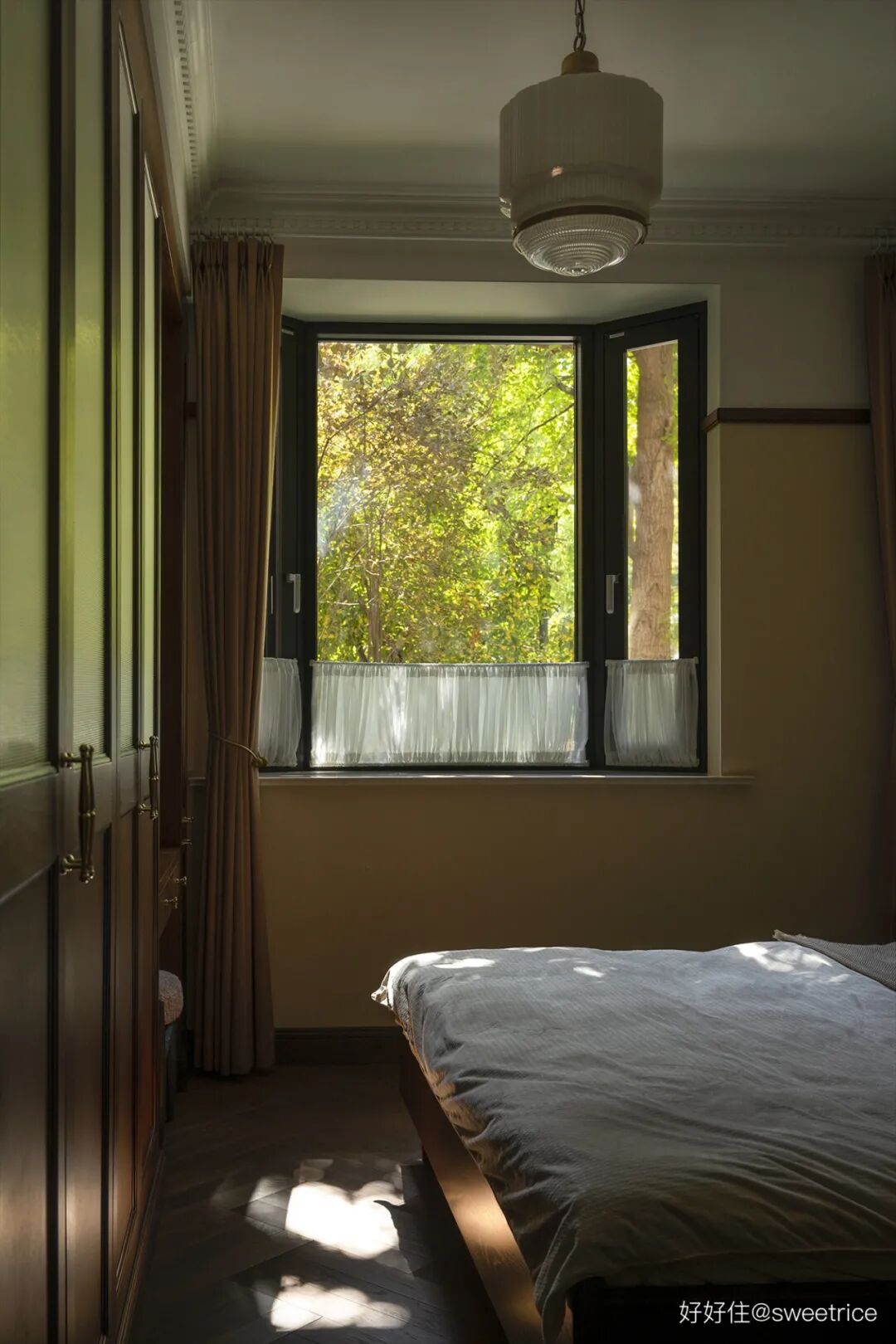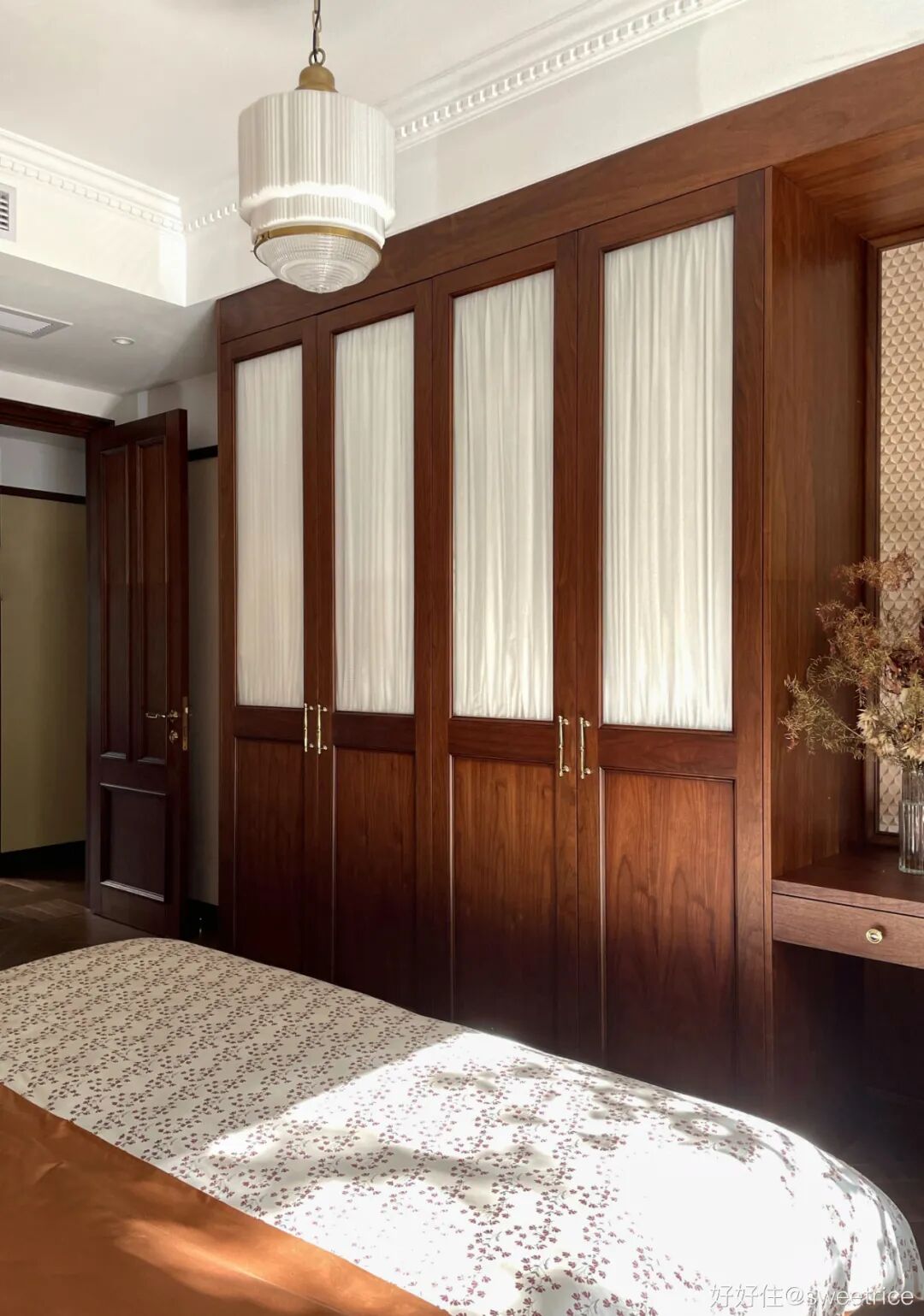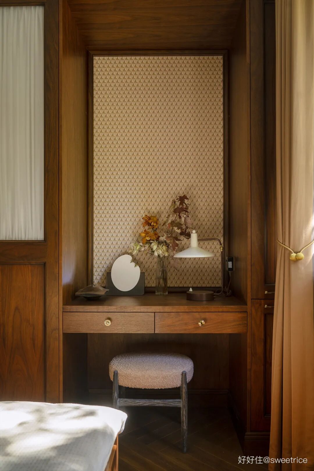 主卧延续了公共空间的木质调,搭配焦糖色丝绒床头,玄关同款墙纸,杏粉色窗帘。整体配色温暖细腻,床头插上橙色的蕙兰和枫叶,瞬间唤醒空间的秋日诗意。