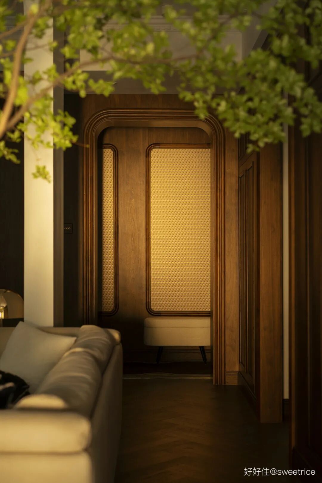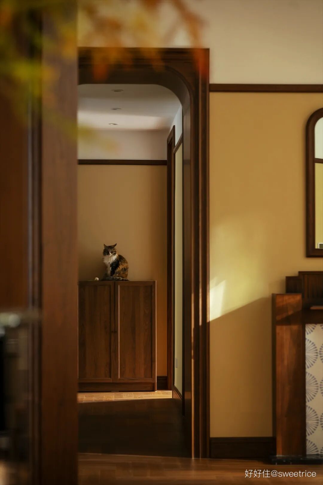 从客厅走廊看玄关,夕阳余晖中,光影书写出无限诗意。