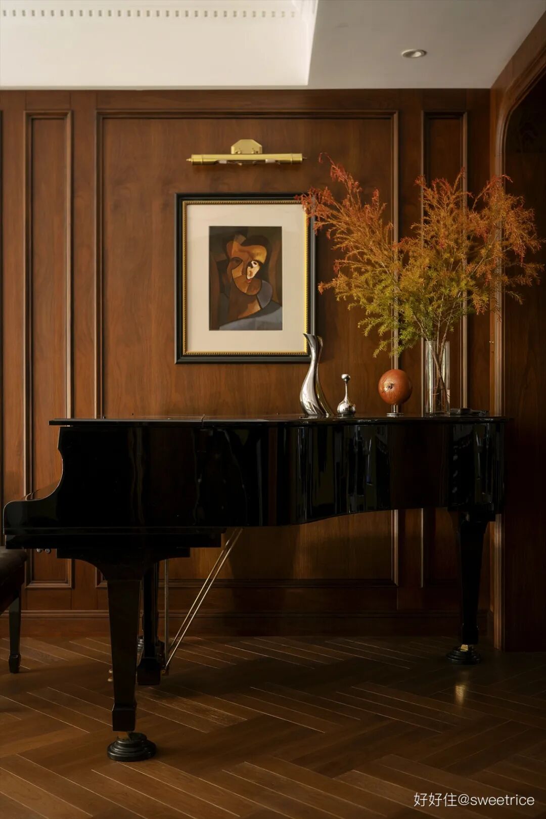 卡哇伊古董三角钢琴放置在客厅一角,复刻阿根廷大师 Emilio Pettoruti 的立体主义画作,为空间配色增加一丝灵动和艺术气息。