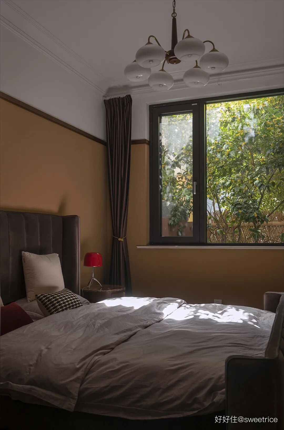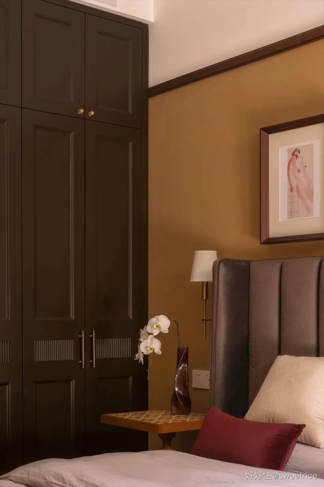 太妃糖色+咖啡棕的配色,使得整个房间明媚温暖,加上酒红色的丝绒抱枕和台灯的点缀,华丽气息更加浓郁,搭配常玉的淡彩涂鸦,给整体配色带来一丝松弛感,优雅精致的调性在细节里流露。