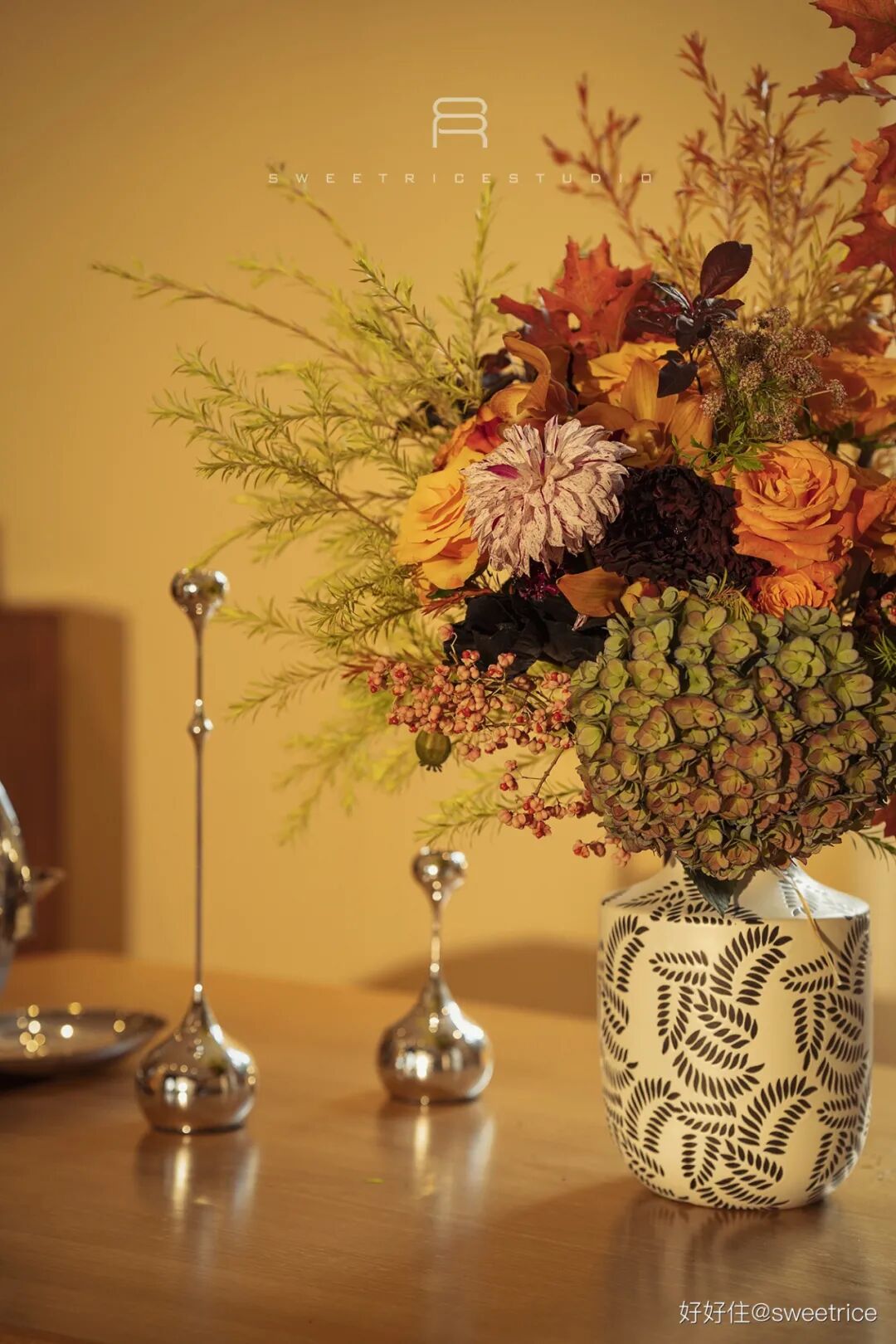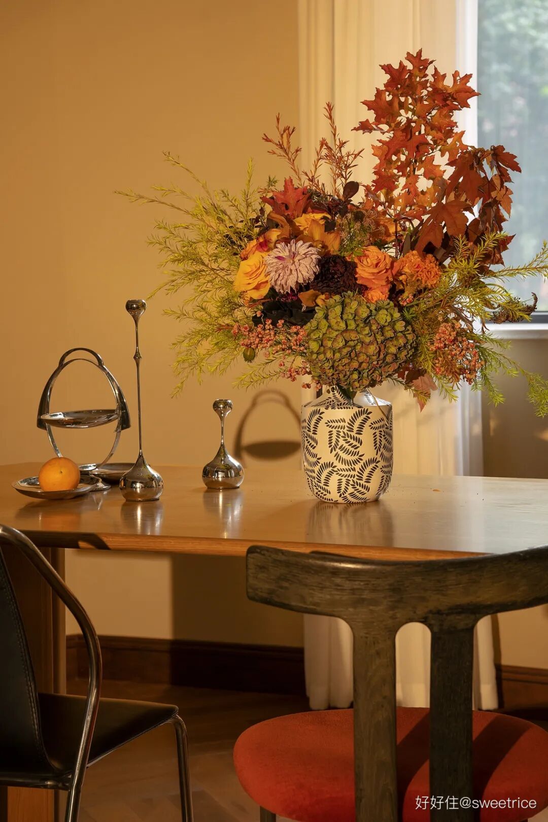 雍容华丽的橙色系插花,给餐厅带来浓浓秋意,花瓶的图案与壁炉的花砖相得益彰,灵动美好。