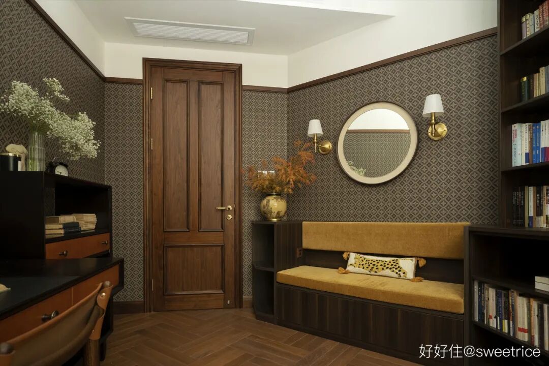 书房是异形结构,设置卡座形成一个安静复古的阅读角,配色复古温馨,书柜满足书籍的收纳需求,书桌矮柜撞色处理,搭配装饰画组,营造浓郁的怀旧氛围。