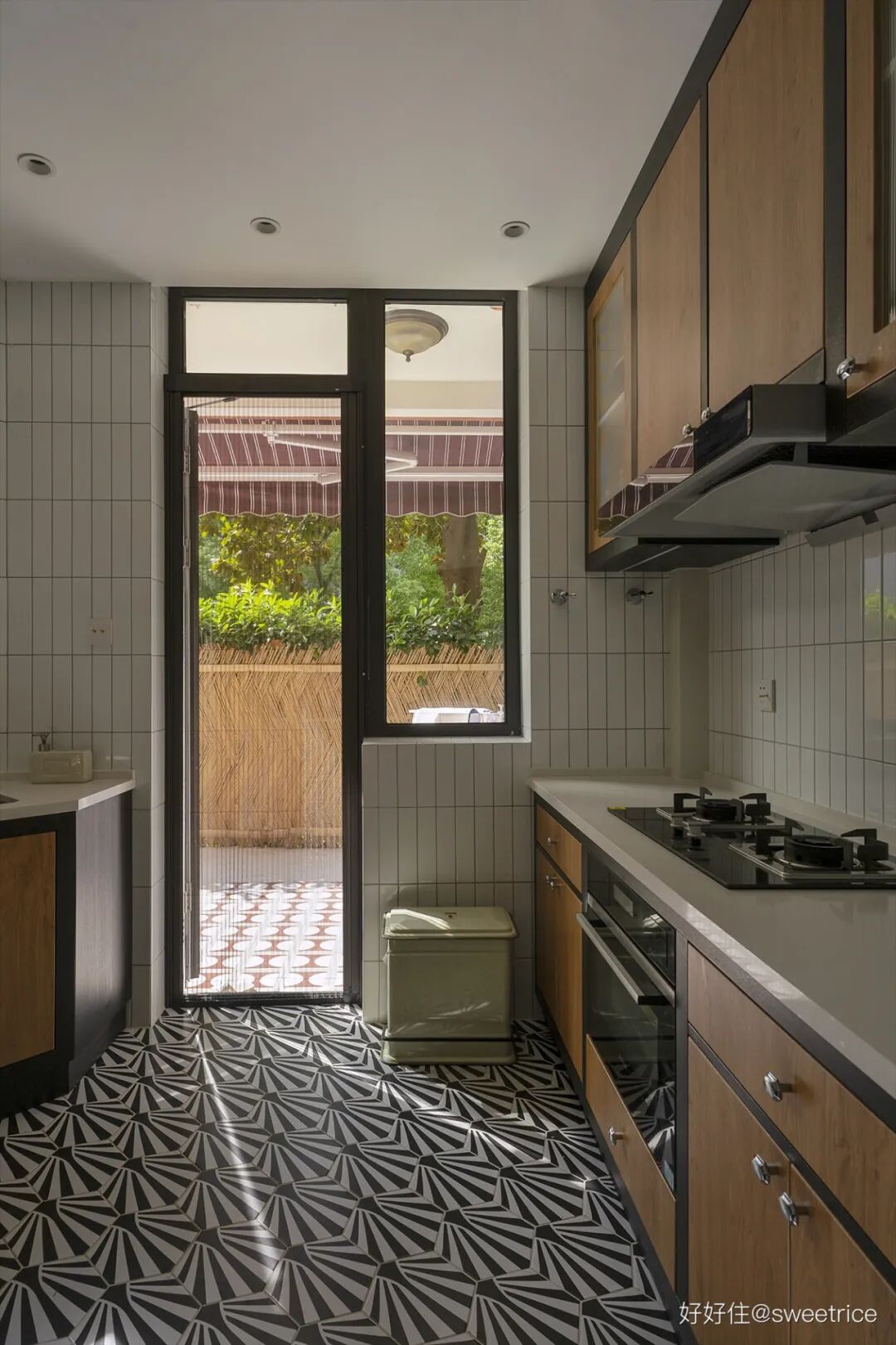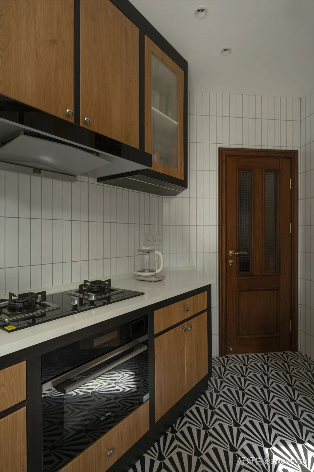 厨房结构异形,冰箱移位后释放出更为宽敞的空间,定制具有 artdeco 风格的几何花砖,搭配黑色与木色撞色的橱柜设计,整个风格时髦又复古。