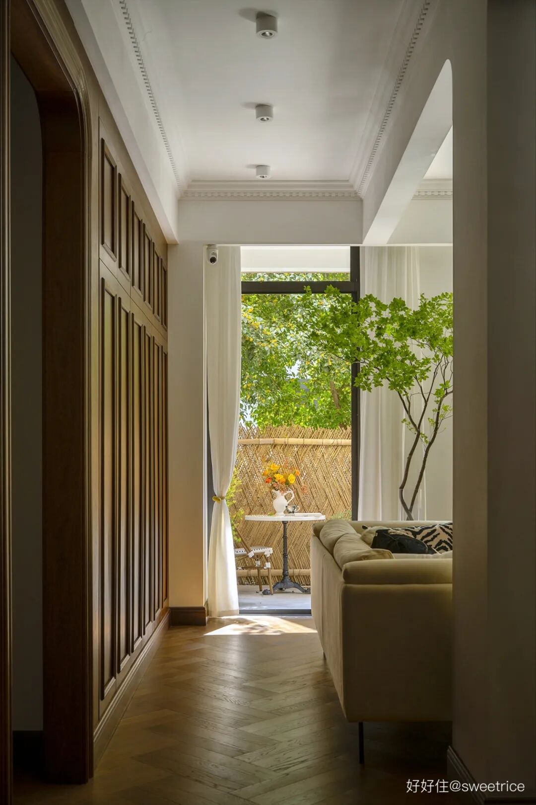 客厅沙发区域增设墙垛、假梁,和背景墙形式的收纳柜组成走廊空间,将人的视线引向户外的庭院。走廊的宽度和层高形成优美黄金比,连续的木饰面柜门、射灯、以及顶棚的装饰线条,都强化了空间的序列感。