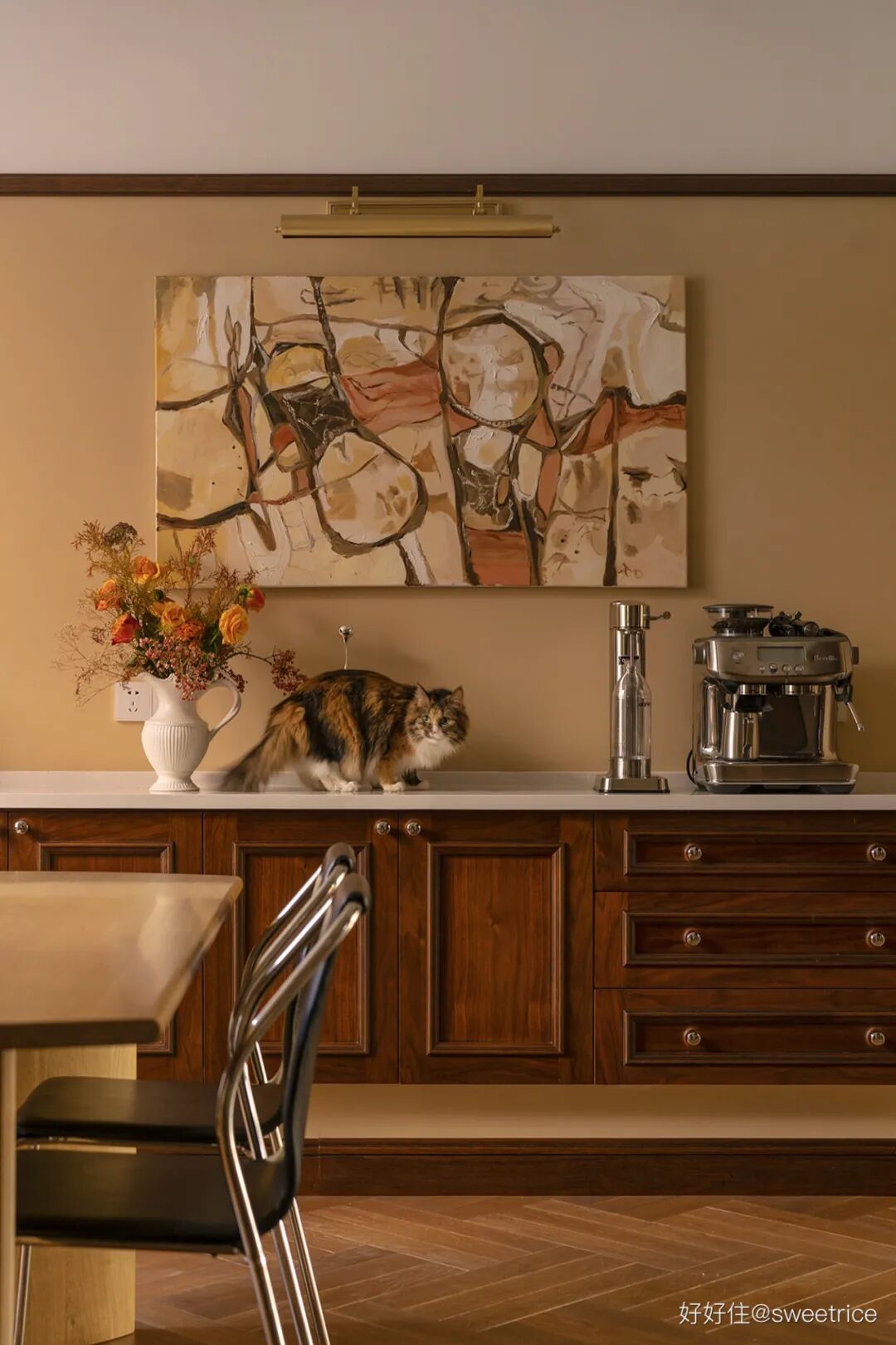 靠墙设计定制了整排的餐边柜,收纳功能强大,搭配装饰画,打造美观实用的咖啡角。