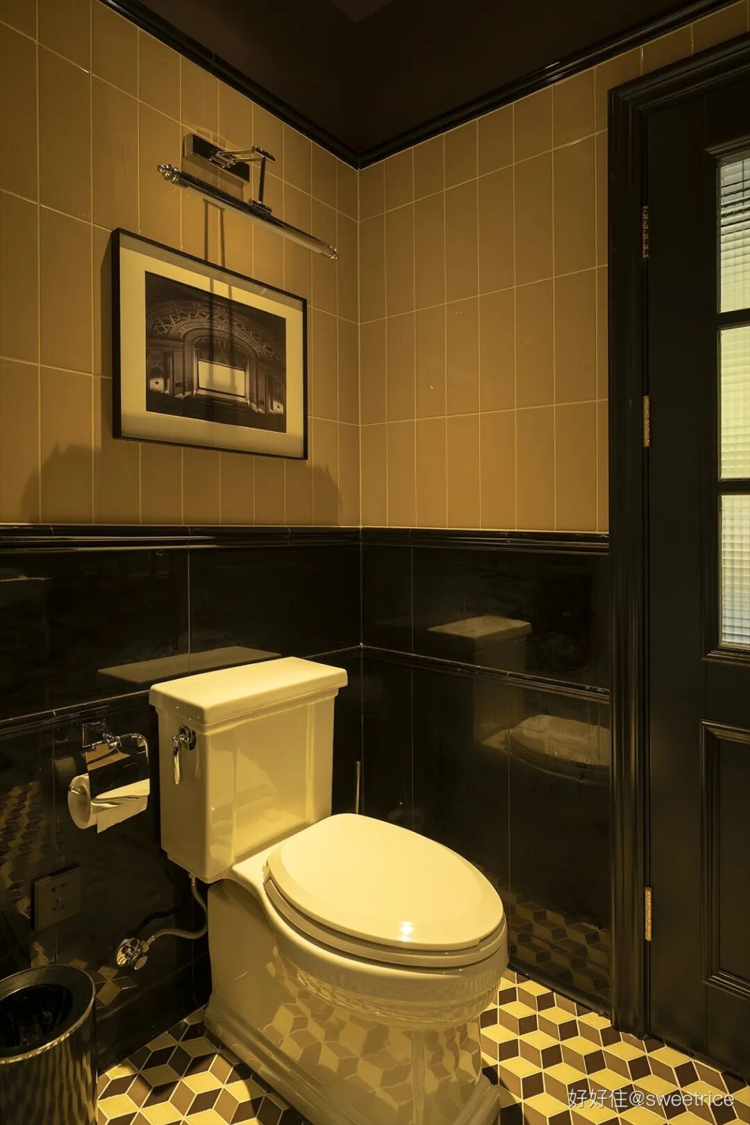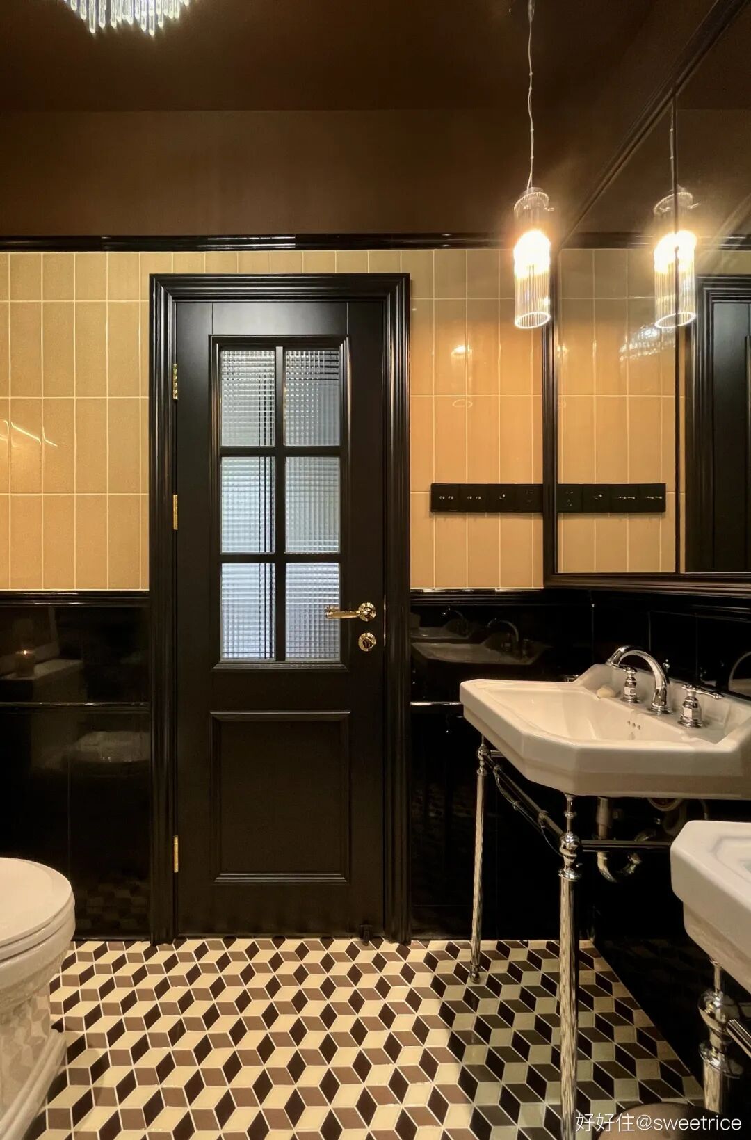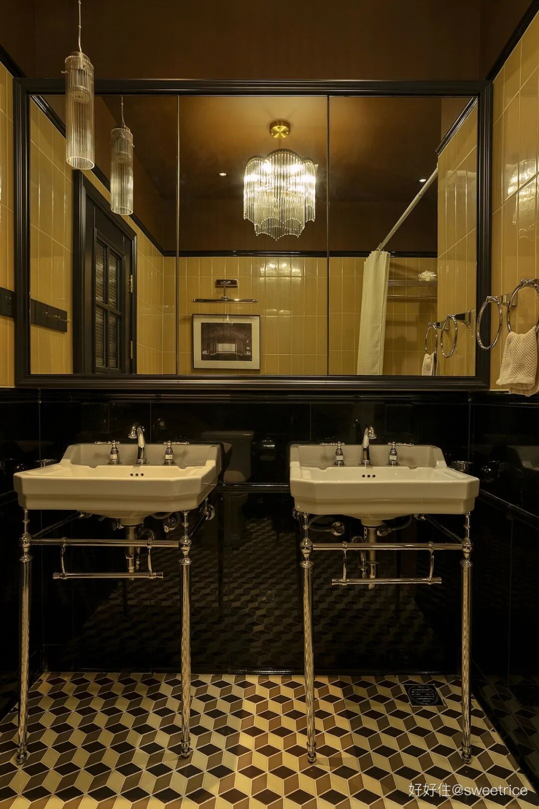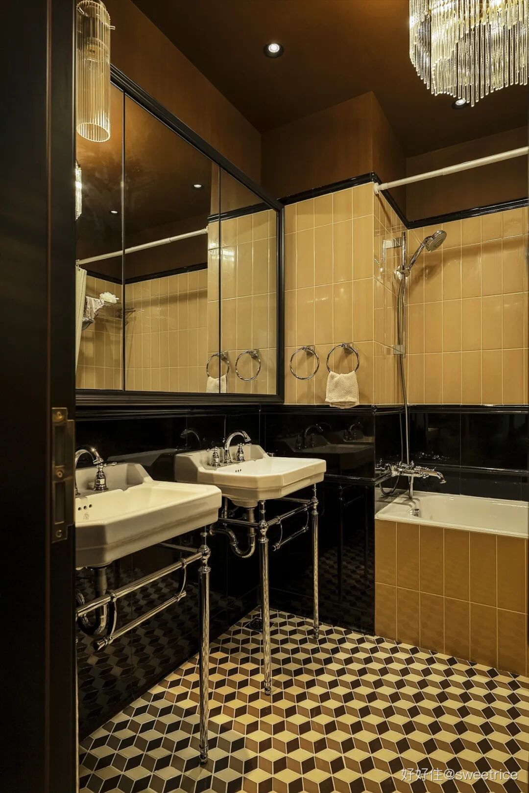 充满浓郁 artdeco 风格的主卫,面积很小,放弃落地浴室柜,改用支架水池来增强通透感;设置满墙尺寸的大镜柜,通过增大反射面积来起到扩大空间的视觉作用;同时又具备强大的收纳功能,实用又有腔调;黑+金棕的配色,强烈对比的深色调将氛围感拉满。水晶吊灯的加入,使得华丽轻奢的气质呼之欲出。