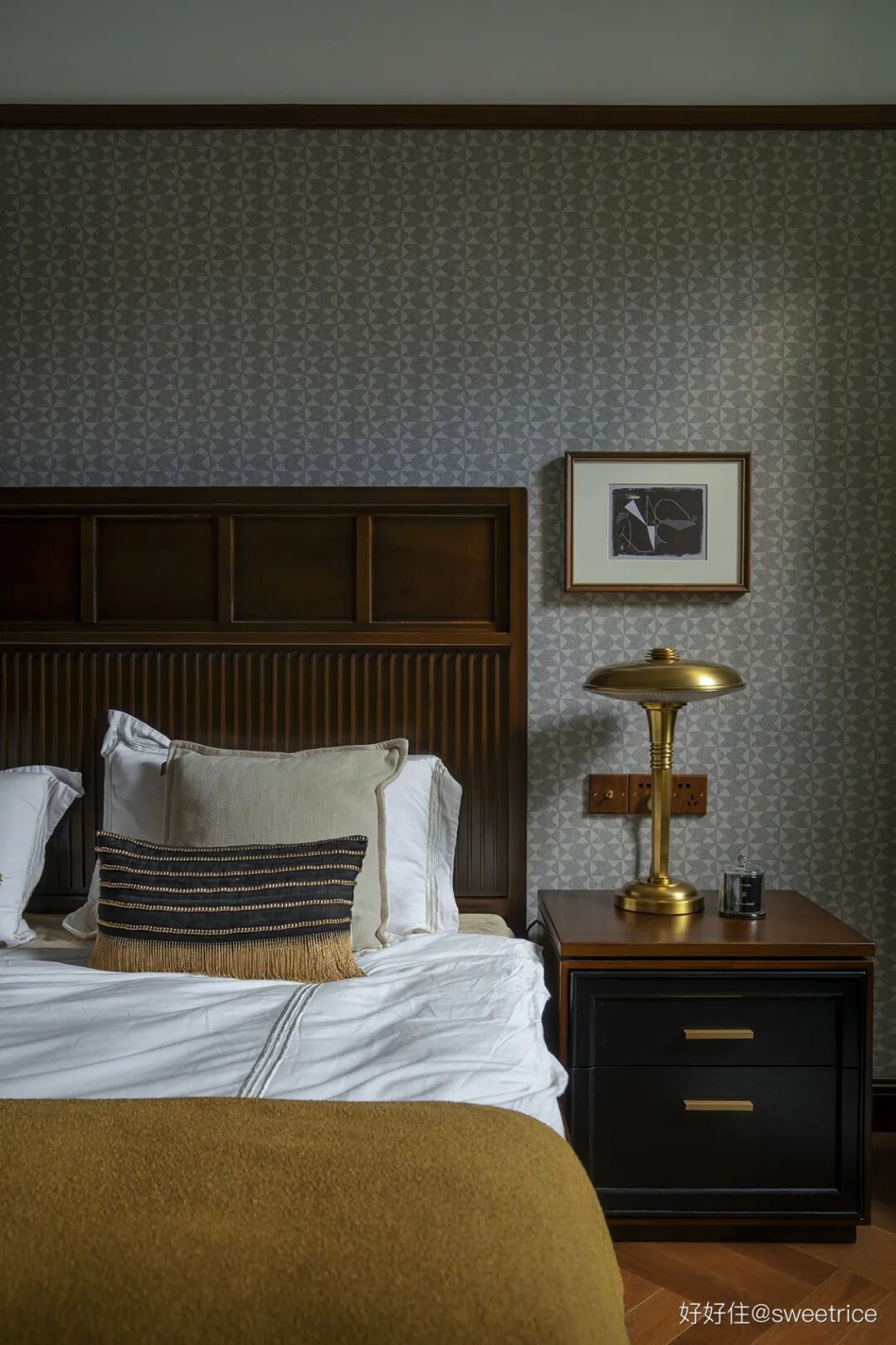 每个空间都延续了木线条做分色的墙面处理,这间卧室用灰色几何图案墙纸饰面,设计定制了 artdeco 风格的复古木制大床,搭配轻奢感的黄铜台灯和黑金抱枕,整体营造出浓郁的复古氛围。复刻装饰画均来自意大利雕塑家 Marino Marini 的作品。