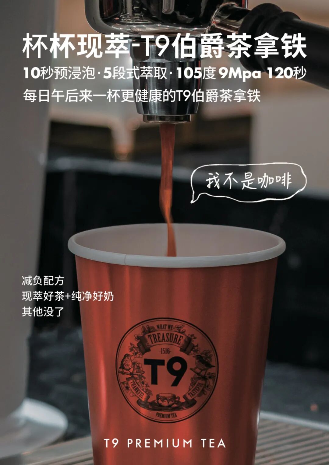 高定价的背后,是T9对产品的信心和底气。与德国180年茶研室合作,茶叶选用高规格的精品茶,产品需要通过欧盟有机认证或瑞士SGS检测,保障品质。同时产品中也会融入T9独有的拼配技术。以皇家伯爵茶拿铁为例,原材料进口后,会使用独家配方再进行复配,增强茶的风味层次。随后使用T9自有的智能萃取设备,完成产品的制作。“我们现阶段是需要2分钟左右才能做出一杯茶拿铁的。因为茶和咖啡不一样,茶是需要萃取一下的。这个萃取的过程,对于普通的茶饮店、奶茶店来说就是有难度的,因为会影响他们的出杯量。这个时间过程使产品的风味更好,但时间其实也是成本之一”。