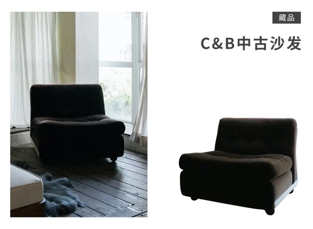 三楼的卧室其实也是一样的思路。意大利国宝建筑设计大师Mario Bellini为C&B设计的沙发,与1960年代的丹麦产沙发床之间,放着一张国内农村来的铁艺小椅子。由于三者造型极其和谐,不少人都误以为这张小椅子也是哪位欧洲设计大师的中古作品。