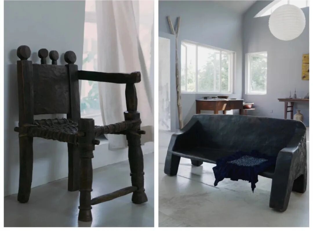 与之搭配的则是一系列来自民间、不知名的老旧家具:清代的大漆钱柜、民国时期的柚木咖啡桌、埃塞俄比亚的皮鞭椅、印度的大烛台……
