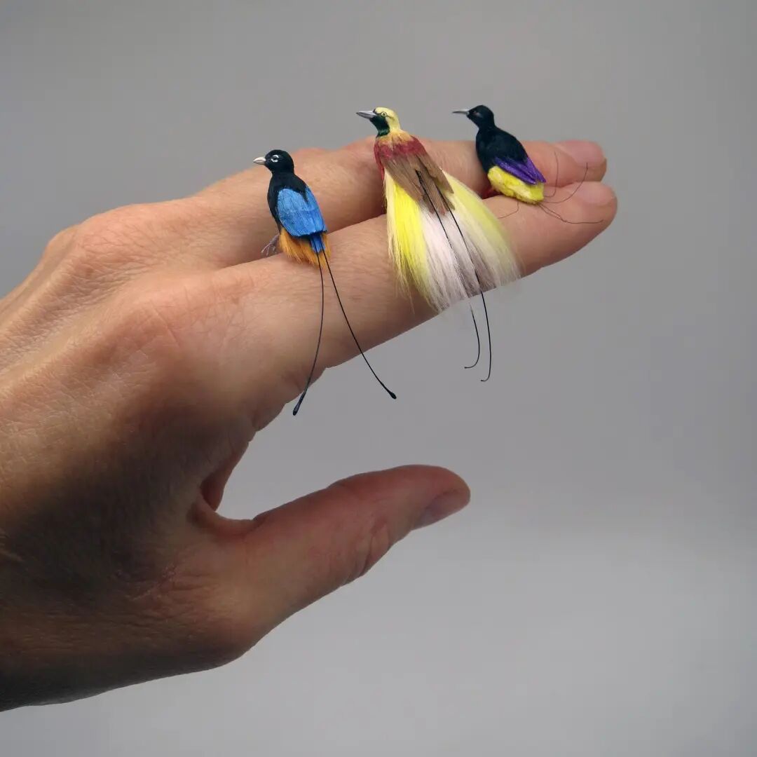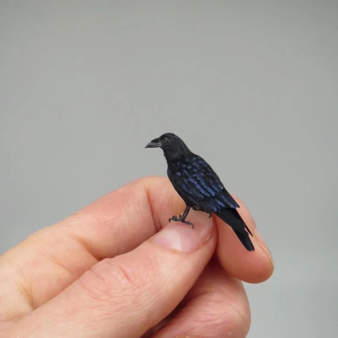 因此,范妮·桑多每制作一个微缩雕塑的周期都很长,虽然只有指甲盖大小,但并不比大型的艺术作品好做,通常她会先花上三五天的时间来观察食实物,充分了解动物的外形线条,然后画下来,再使用聚合物粘土、鸟类的羽毛、动物的毛皮和其他材料,以1:12的比例雕刻出精确的微缩模型。