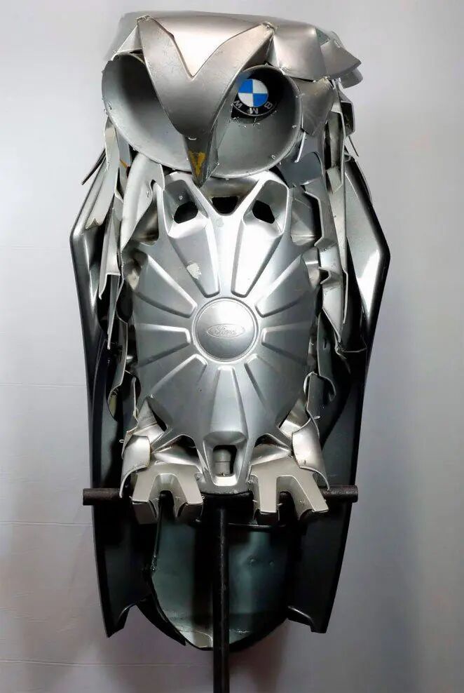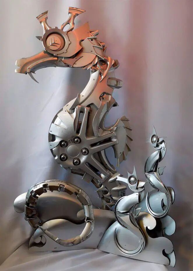 有人会说,把汽车轮毂做成雕塑非常可惜,当你看到他的废品雕塑作品后,你就会觉得,即使这些汽车轮毂是全新的,被制作成这样精彩的雕塑作品,也是值得的,更不用说这些轮毂都是废弃的材料。