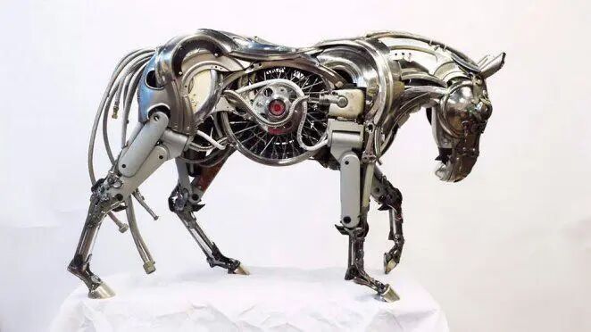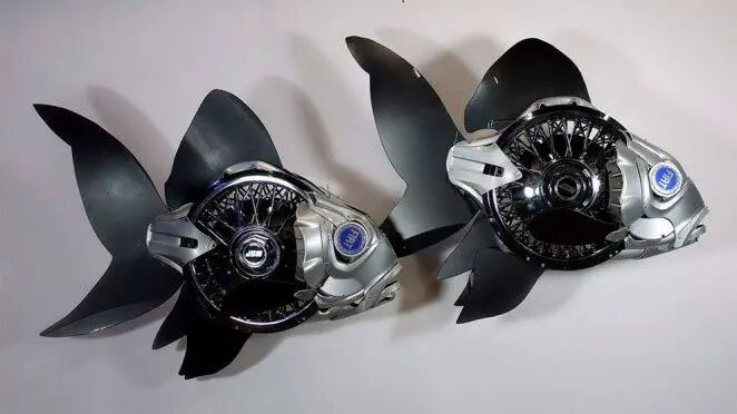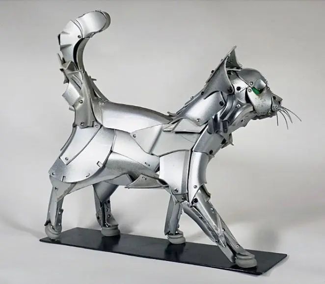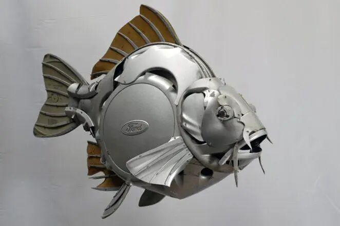 如果没有被这位名叫托勒密·埃尔林顿的废品艺术家看到,这块钢材或铝合金,会被回收,然后重新锻造成其他的物品,而这个废弃的轮毂到了他的手里,通过切割和焊接后,摇身一变成为一个个十分精彩的动物雕塑作品,每一个都时尚感和科技感十足,让人看到后,不禁感叹,这才是汽车轮毂最好的归宿。