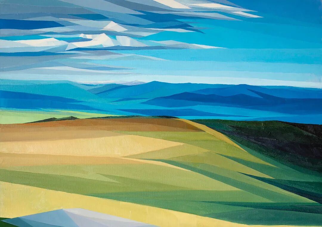 小绛非常喜欢《大地之色》,这组极简油画作品,它将原本物体多变的形状,直接用直来直去的线条进行表达,而绚丽的颜色也被归纳成单一色调。虽然,奥尔加·布罗夫琴科在原本的风景做减法,但是,完成后的画作,并没有我们想象的那么简单。
