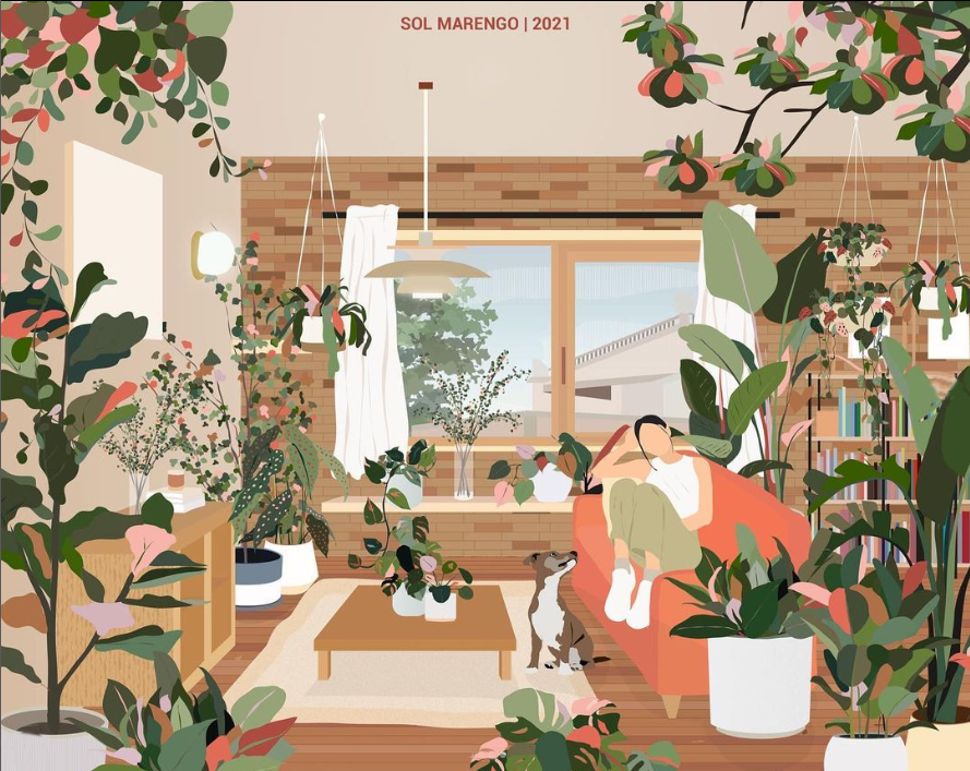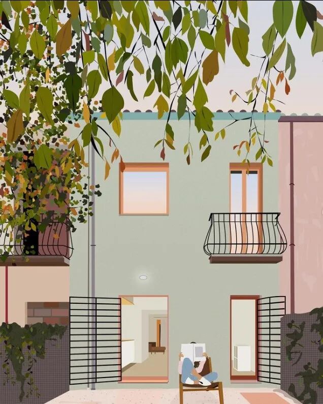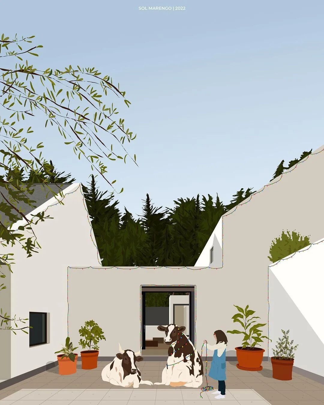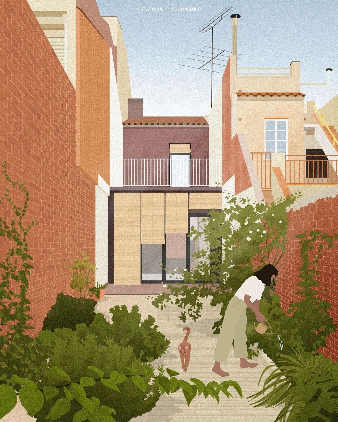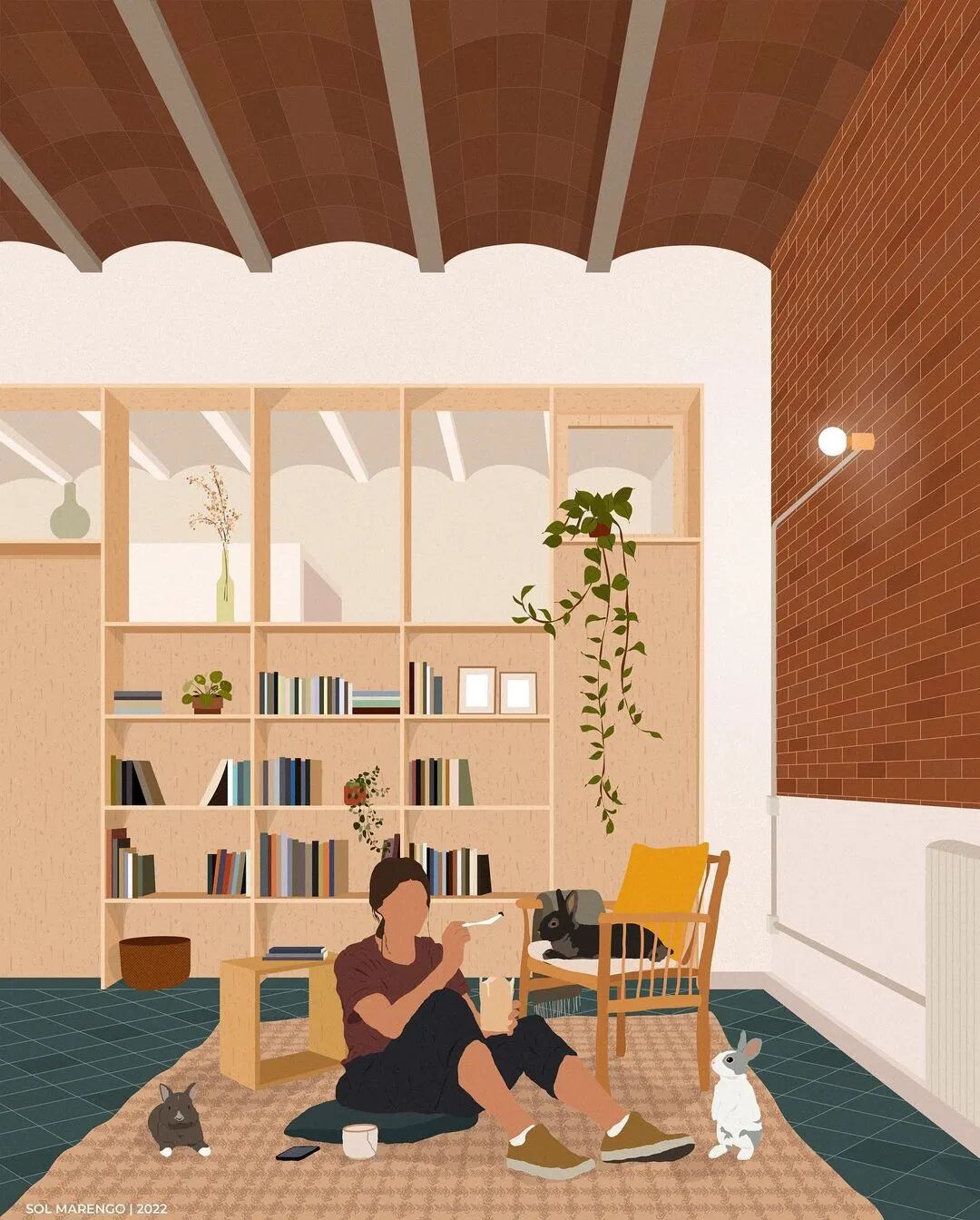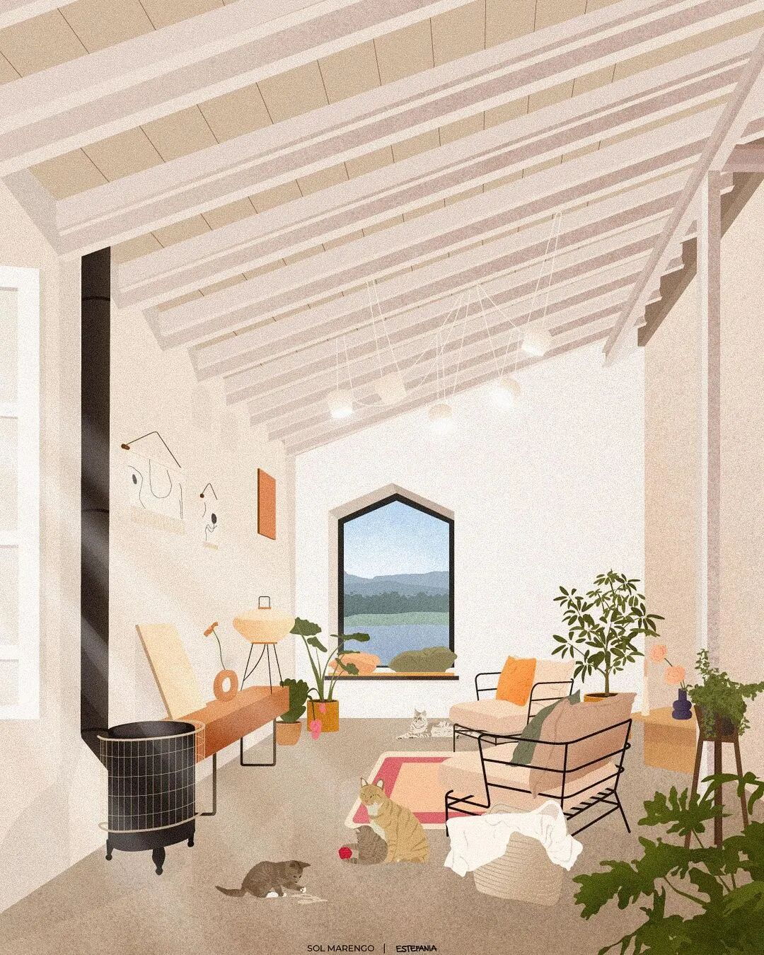 这些插画来自艺术家ins@sol_ms,画面里的家或简单温馨,或温暖明媚,每一幅插画都描绘出了一个理想幸福的家。