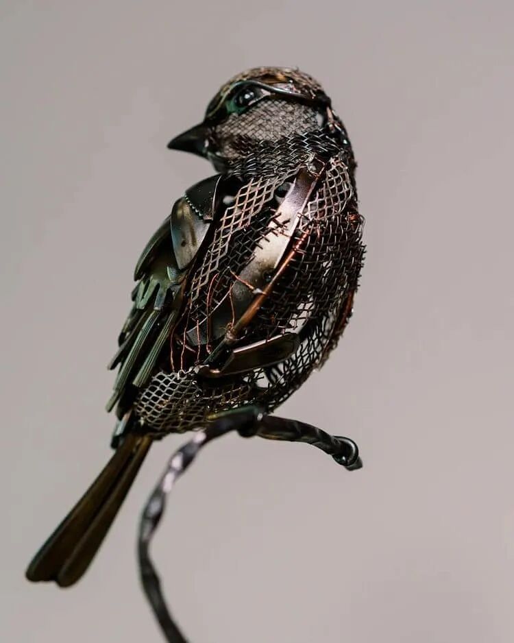 利亚·杰弗里使用的材料都是一些小的碎片,从破掉的金属网格,到时钟里的旧齿轮,最小的还没有一粒黄豆大,最大的也只有手臂那么长,她将这些细小的零件焊接在一起,组成了鸟类、青蛙、兔子等精美的现代雕塑,尽管这些动物是旧金属焊接而成,却非常的生动逼真,更令人佩服的是,艺术家还保留了单个金属部件的独特特征,我们可以轻易看到,动物身体的哪一个部位是用什么金属零件焊接的。