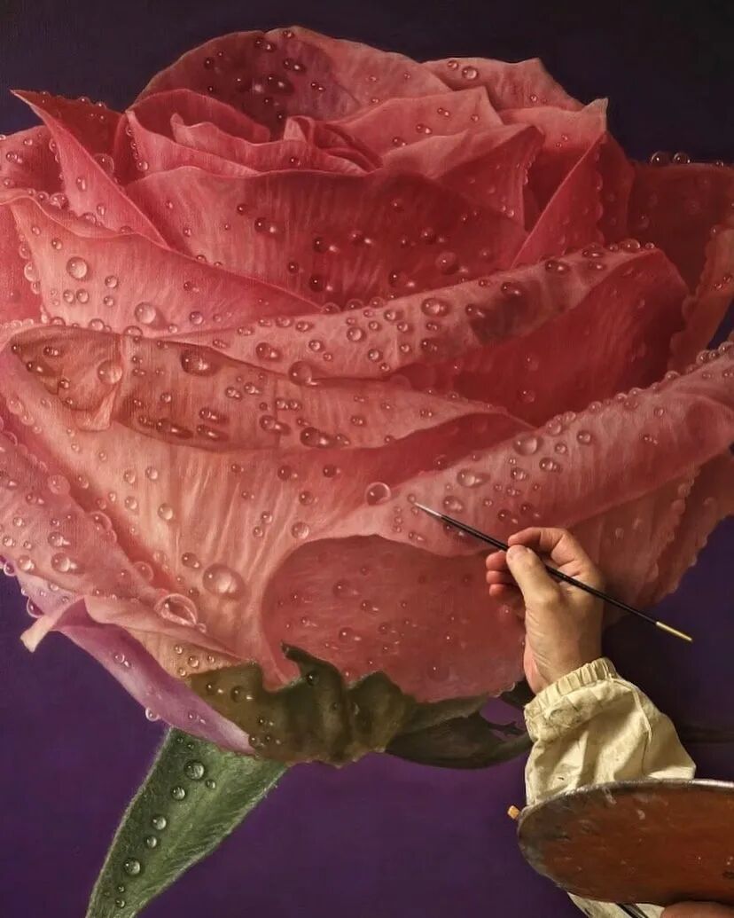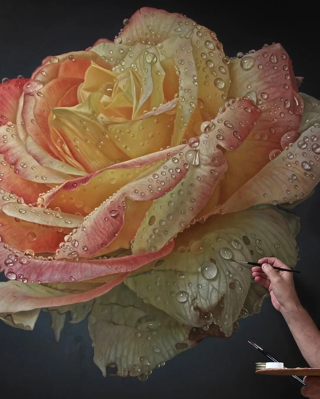 这位艺术家为花朵提供了逼真的深度,增强了花朵的外观,鲜艳的色彩也为作品的视觉效果增色不少。逼真源自于艺术家对每个微小细节的捕捉,花瓣上的露珠,都融入了光线和阴影,就好像有阳光直射在花朵上。如此真实,感觉就像伸出手,就可以从画中将这朵花摘下来一样。