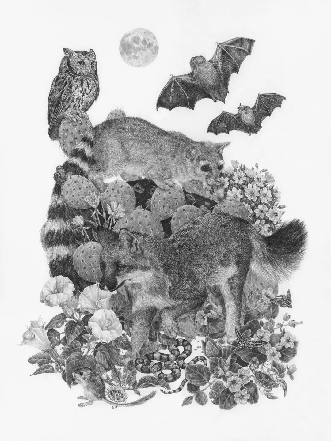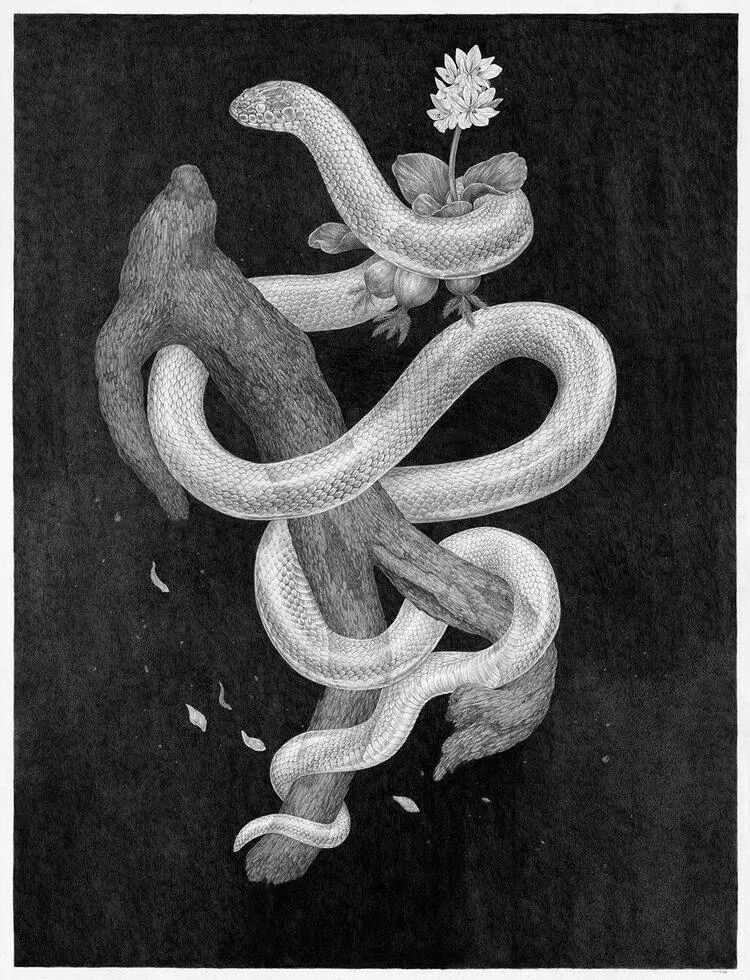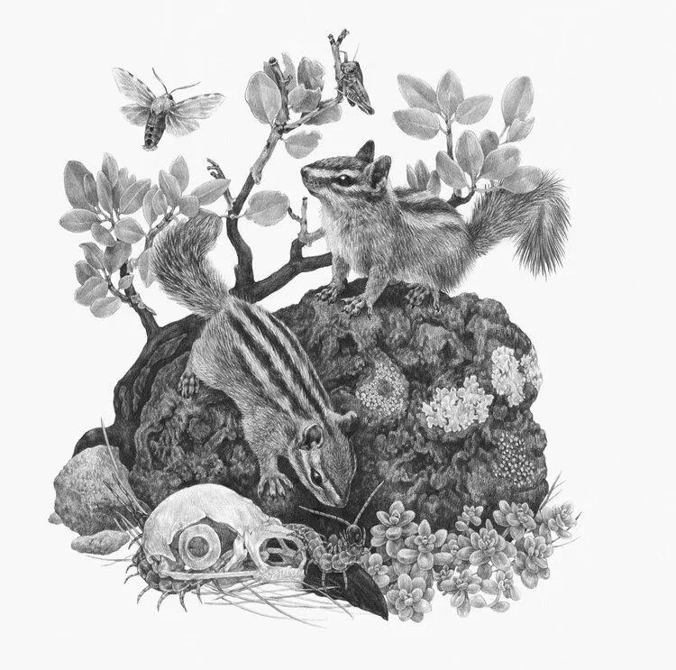 佐伊·凯勒的大部分作品,都是用不同硬度的铅笔绘制而成的,少部分也用到了数字媒体来建模,为了渲染出视觉叙事感,带给人更生动的视觉效果。她笔下的生物不能被笼统地概括为鸟、蛇、植物等等,而是更加具体,比如大盆地响尾蛇、加利福尼亚王蛇、悬崖花栗鼠、铁线蕨、郊狼灌木......