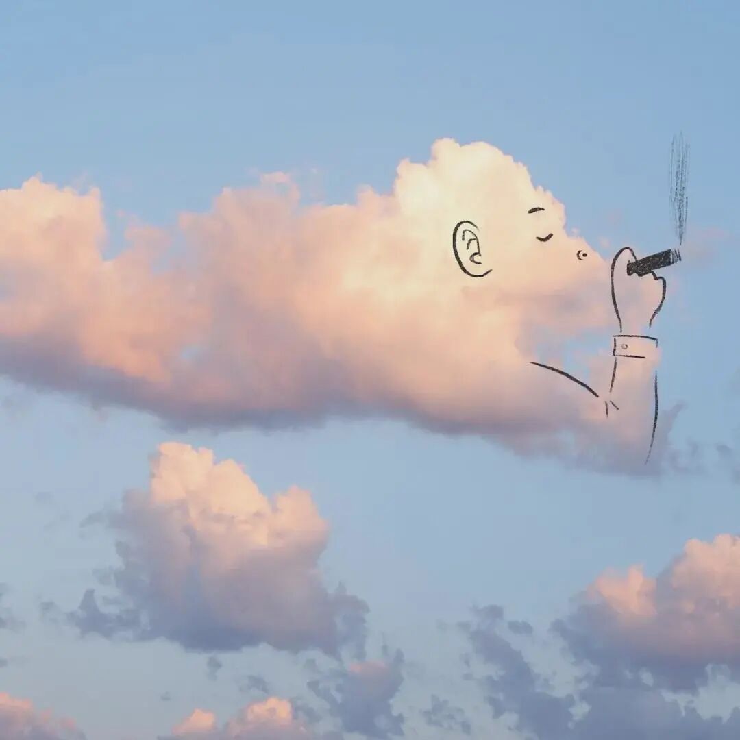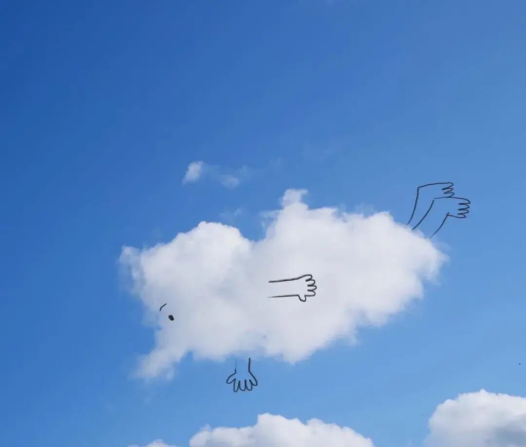之所以寥寥几笔就能让画面变得生动有趣,是因为艺术家会借助云朵的形态,来进行加工创作,先观察一朵云的形状像什么,然后再根据想象去添加笔触。