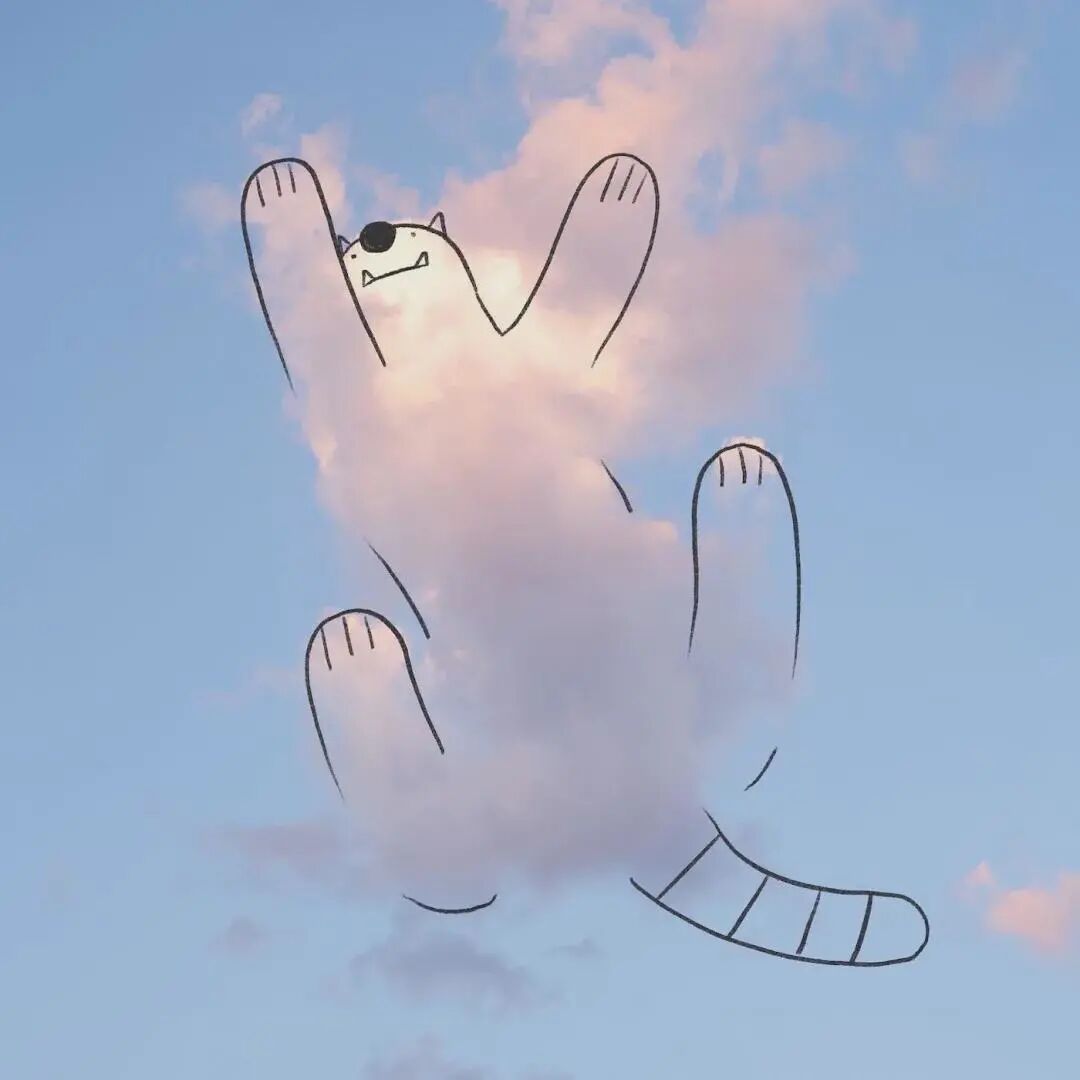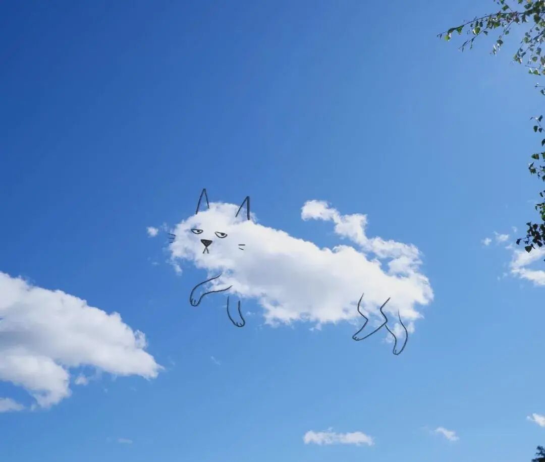 神奇的是,这位艺术家并没有使用多么复杂的笔触,而是人人都会画几笔的简笔画,就让画面变得完全不一样。比如,克里斯·贾奇在一团白云的基础上,画了两只耳朵,四条小腿,一只憨态可掬的小花猫就出现了,在另一团云彩上画一只眼镜,一只耳朵,一个有辨识度的人脸就出现了。